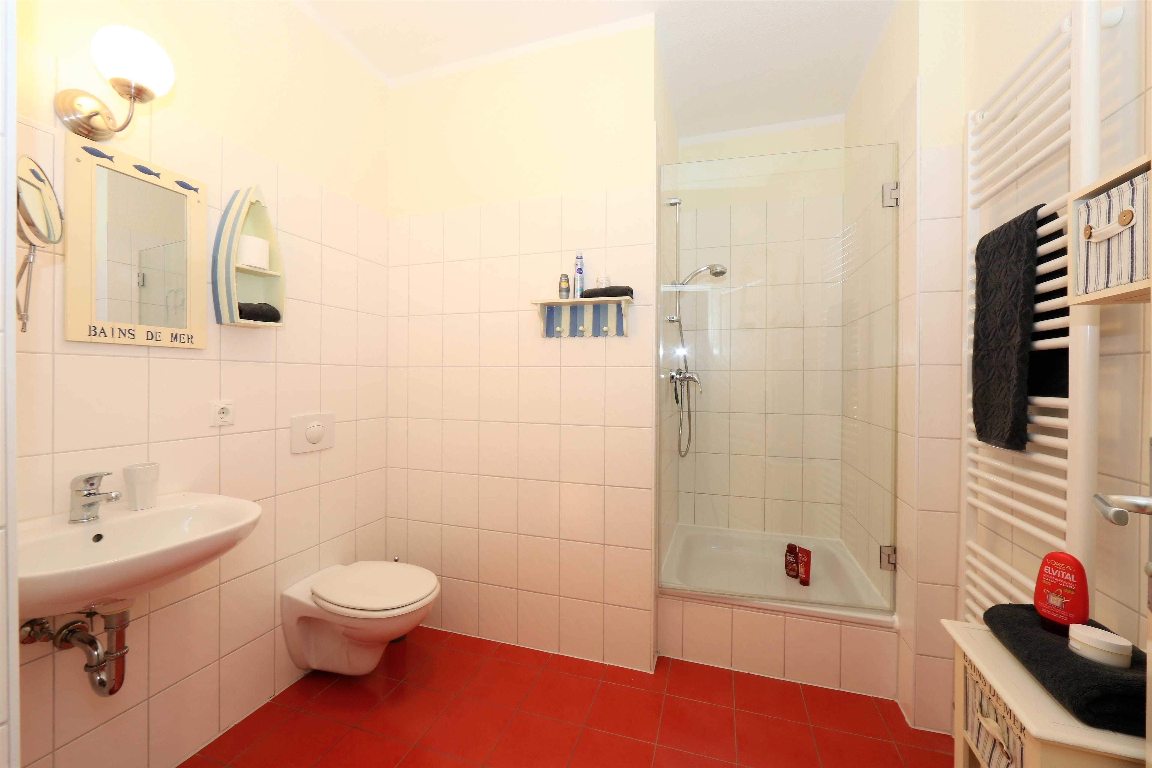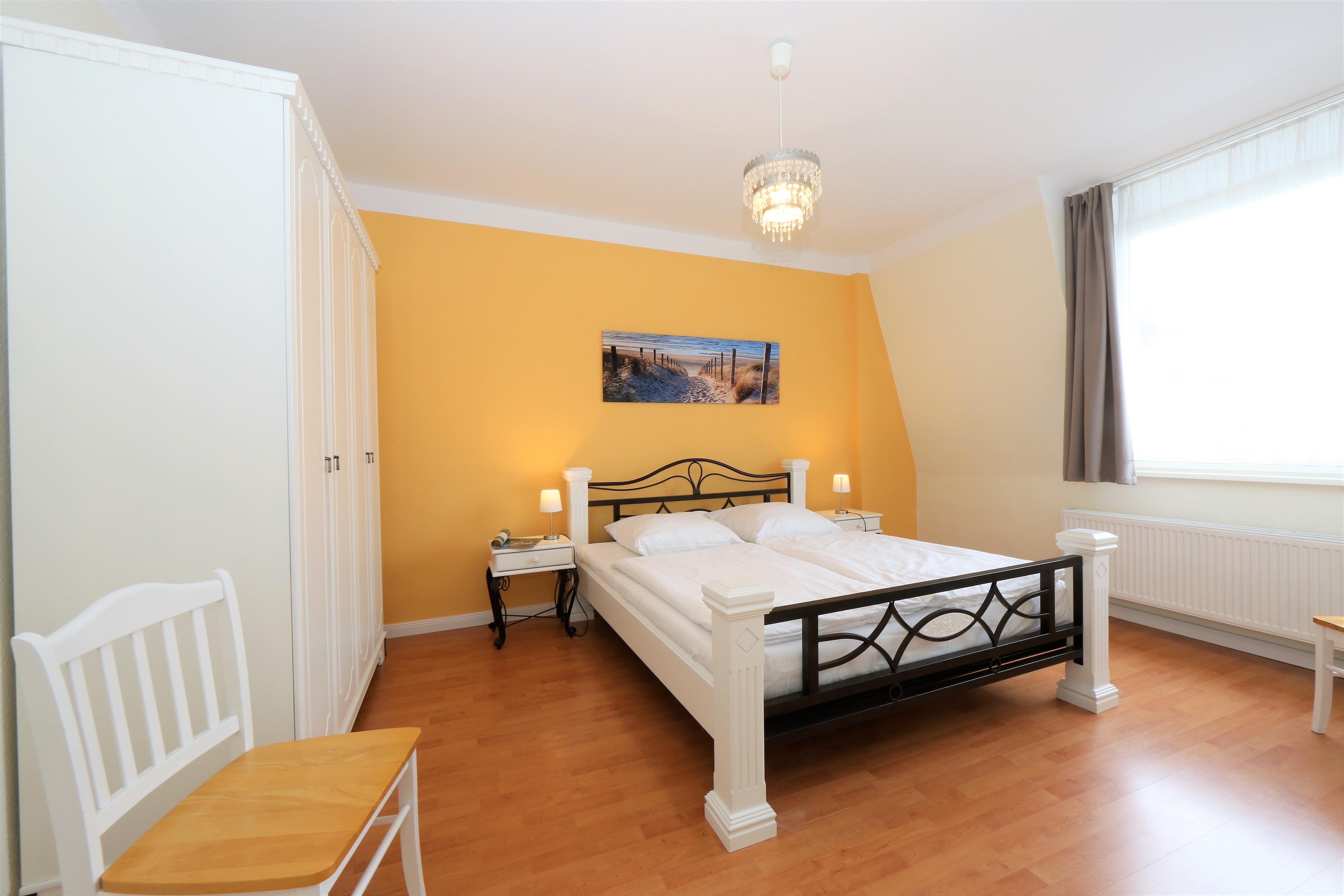 Dieses ca. 57 qm große 3-Zimmer-Appartement liegt im 2. Ober- bzw. Dachgeschoss und ist für 3 bis 4 Personen geeignet. Im gemütlichen Wohnraum finden die Gäste eine Sitzgarnitur mit Schlaffunktion (1,25 x 2,00 m) sowie TV und Radio. Die offene Vollküche inclusive Geschirrspüler, Cerankochfeld, Kühlschrank, Mikrowelle etc. ist ebenfalls im Wohnraum integriert. An dem großen Esstisch in der hellen, sonnigen, geschlossenen Loggia (Fenster lassen sich öffnen) können die Mahlzeiten eingenommen werden. Das großzügige Schlafzimmer ist mit einem Doppelbett mit getrennten Matratzen (90 x 200) und reichlich Schrankraum ausgestattet, das kleine Schlafzimmer mit einer Liege (90 x 200) . Im innenliegenden Badezimmer stehen Dusche, Waschbecken/WC zur Verfügung.