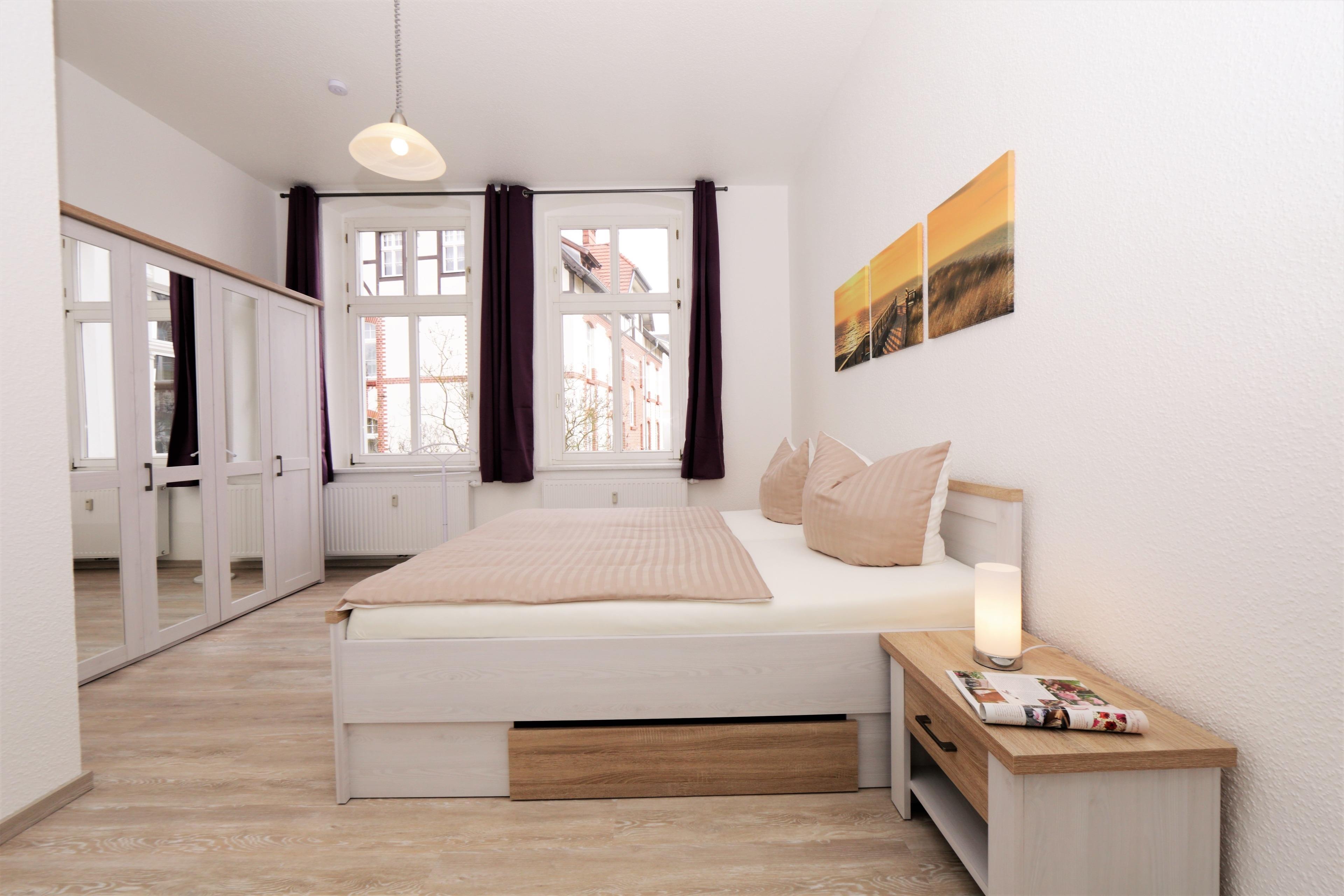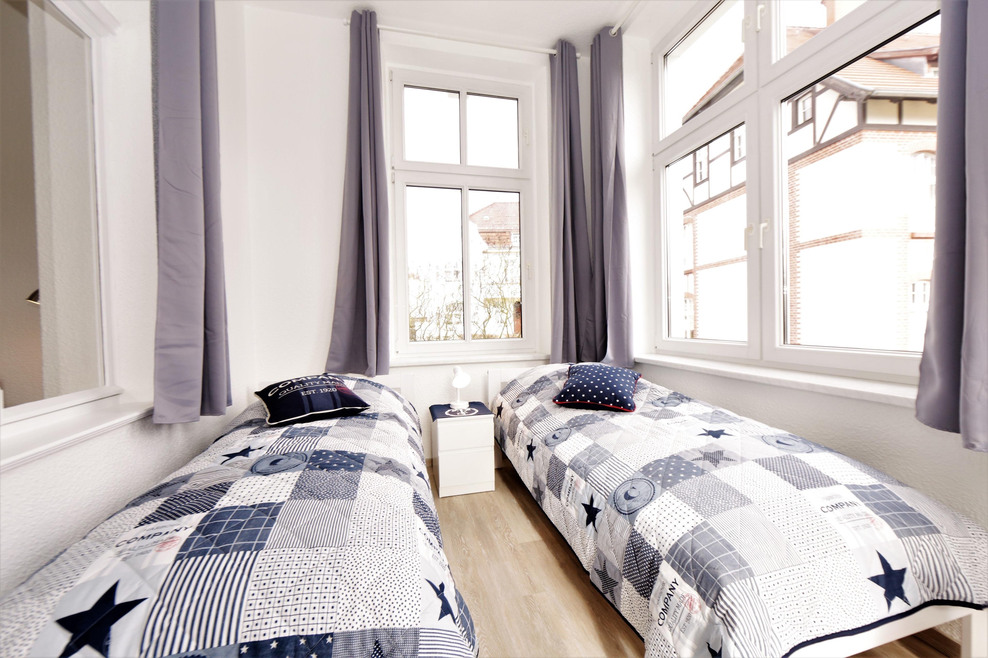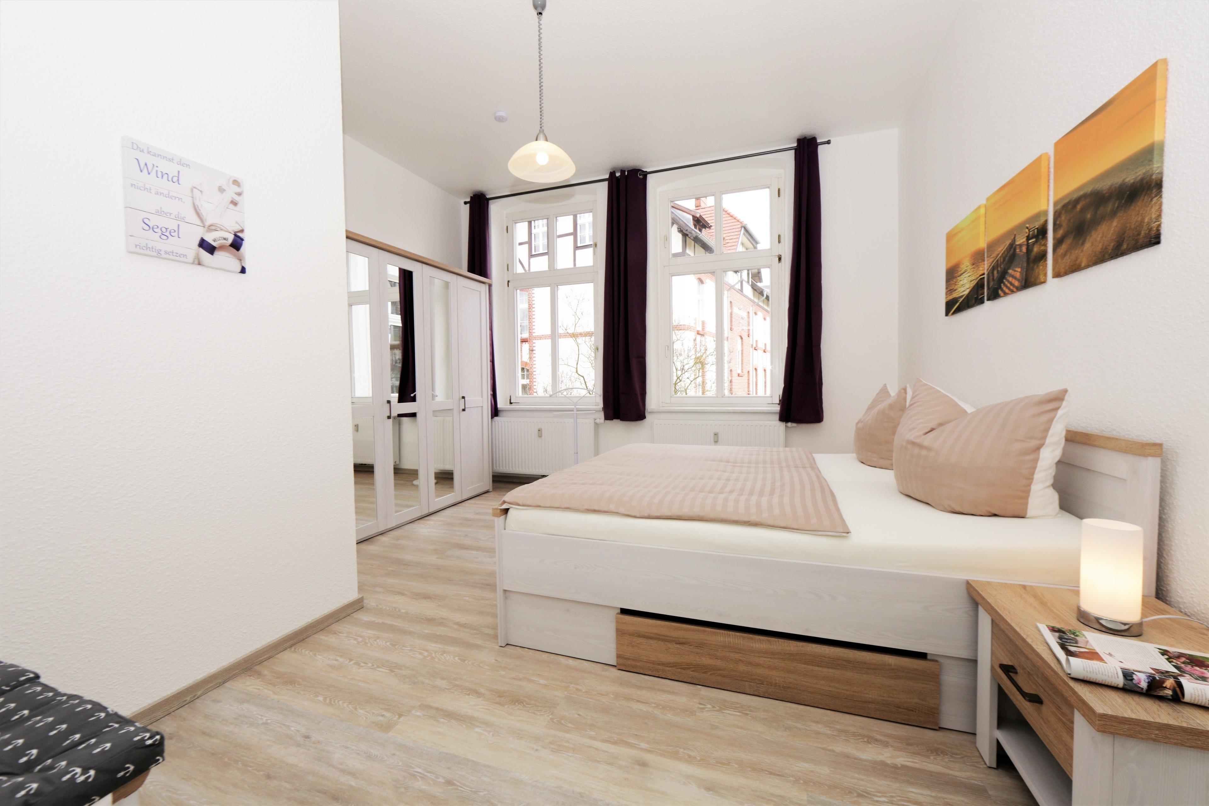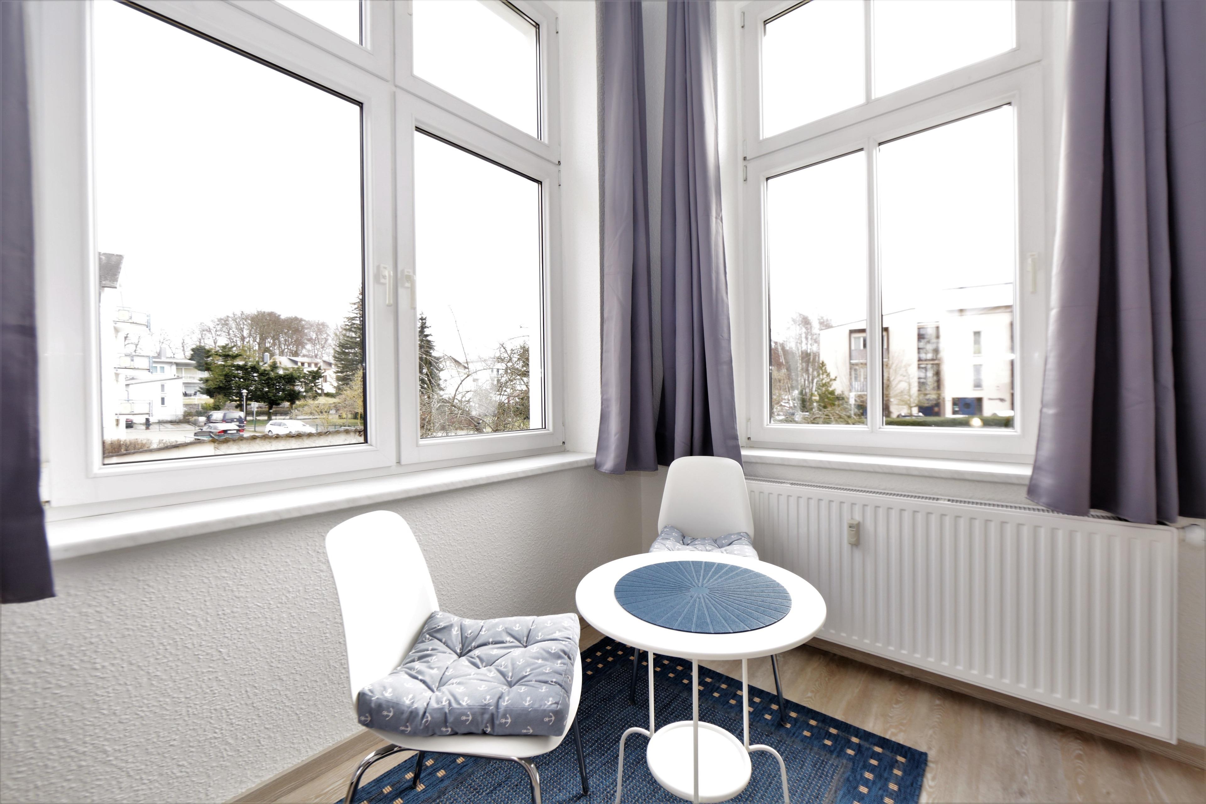 Die moderne, familienfreundlich und maritim eingerichtete Ferienwohnung mit 71 m² Wohnfläche befindet sich im Hochparterre der Villa. Die sonnige südöstliche Ausrichtung der Wohnung zum Garten garantiert Ruhe und die Deckenhöhe von 3,20 m macht das Wohnklima auch an warmen Sommertagen angenehm. Die Wohnung ist individuell und komfortabel ausgestattet und wurde 2017 bzw. 2018 komplett neu renoviert und eingerichtet. Vom Flur mit Flurgarderobe erreichen Sie zum einen ein geräumiges, bequemes Schlafzimmer mit einem Doppelbett (getrennte Matratzen 100 x 200 cm) und einem 5-türigen Kleiderschrank. Zum anderen gehen Sie vom Flur aus in das großzügige kombinierte Wohnzimmer mit gemütlicher Couchecke und TV sowie der offenen Küche mit dem Essplatz für 4 Personen. Die Einbauküche verfügt u. a. über einen Backofen, Cerankochfeld, Geschirrspüler und eine Kühl-/ Gefrierkombination. Ein zusätzlicher Raum zum Schlafen oder Erholen mit 2 separaten Single-Betten für die Kinder oder einfach zum Zurückziehen steht in der an den Wohnraum angrenzenden Loggia zur Verfügung. Das moderne Bad ist mit einer Dusche und Waschtisch/WC ausgestattet. Ein PKW-Stellplatz befindet sich auf dem Grundstück und ist der Wohnung zugeordnet.