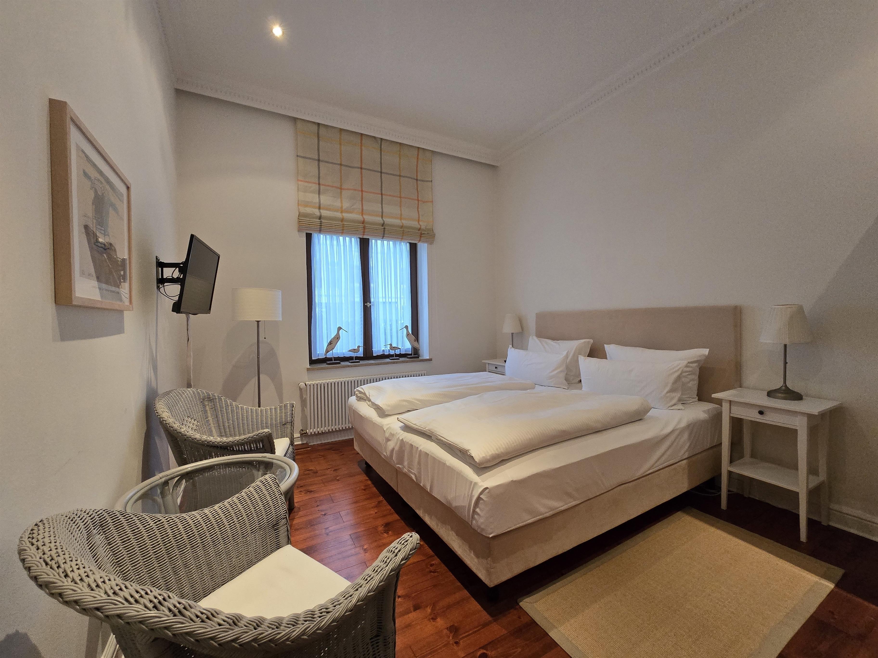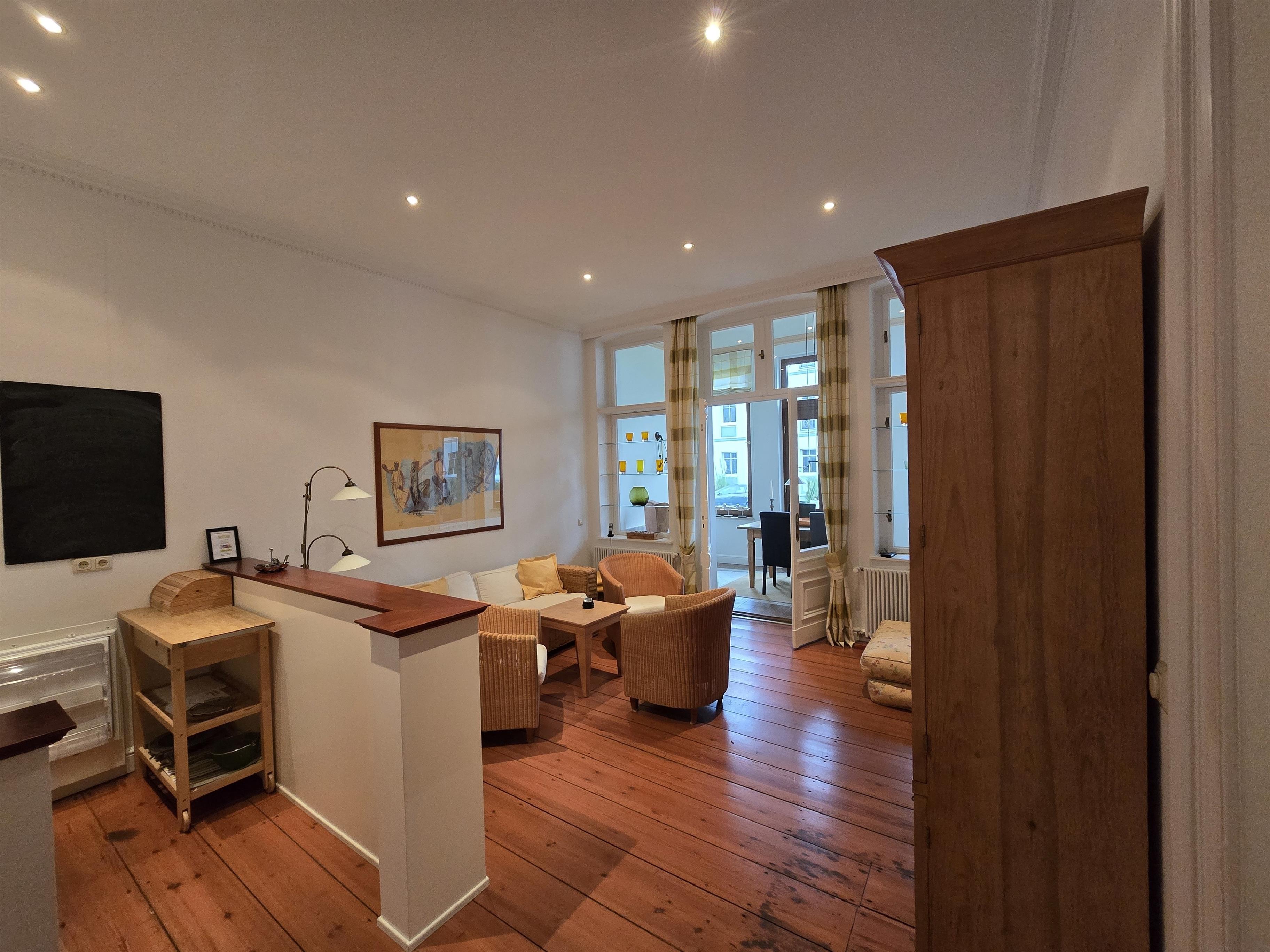 Diese modern und gemütlich eingerichtete 3-Zimmer Wohnung ist 94 qm groß und liegt im Erdgeschoss der im Jahr 1895 als Sommerresidenz erbauten Villa Kramme. Sie bietet 4 - 5 Personen viel Platz für einen erholsamen Ostseeaufenthalt. Der helle Wohnraum verfügt über eine Rattancouch und Sessel sowie einen großen Flat TV. Offen im Wohnraum integriert wurde die Vollküche incl. Geschirrspüler, Ceranfeld, Backofen mit integrierter Mikrowelle, Kühlschrank etc. Der Essplatz in der lichtdurchfluteten Loggia lädt zu gemeinsamen Mahlzeiten ein. Von hier können Sie das Treiben auf der Heringsdorfer Kulmstraße bestens beobachten. Ein großzügiges und modern eingerichtetes Schlafzimmer befindet sich auf der Rückseite des Hauses und ist mit einem komfortablen Doppelbett mit getrennten Matratzen (90 x 200), ausreichend Schrankraum und einer zusätzlichen Schlafcouch (0,70x2,00) ausgestattet. Das 2. Schlafzimmer bietet den Gästen ein Boxspringbett (getrennte Matratzen 0,90x2,00), eine Sitzgelegenheit sowie genügend Platz für Ihre Kleidung. Zwei Bäder runden diese Wohnung ab.
