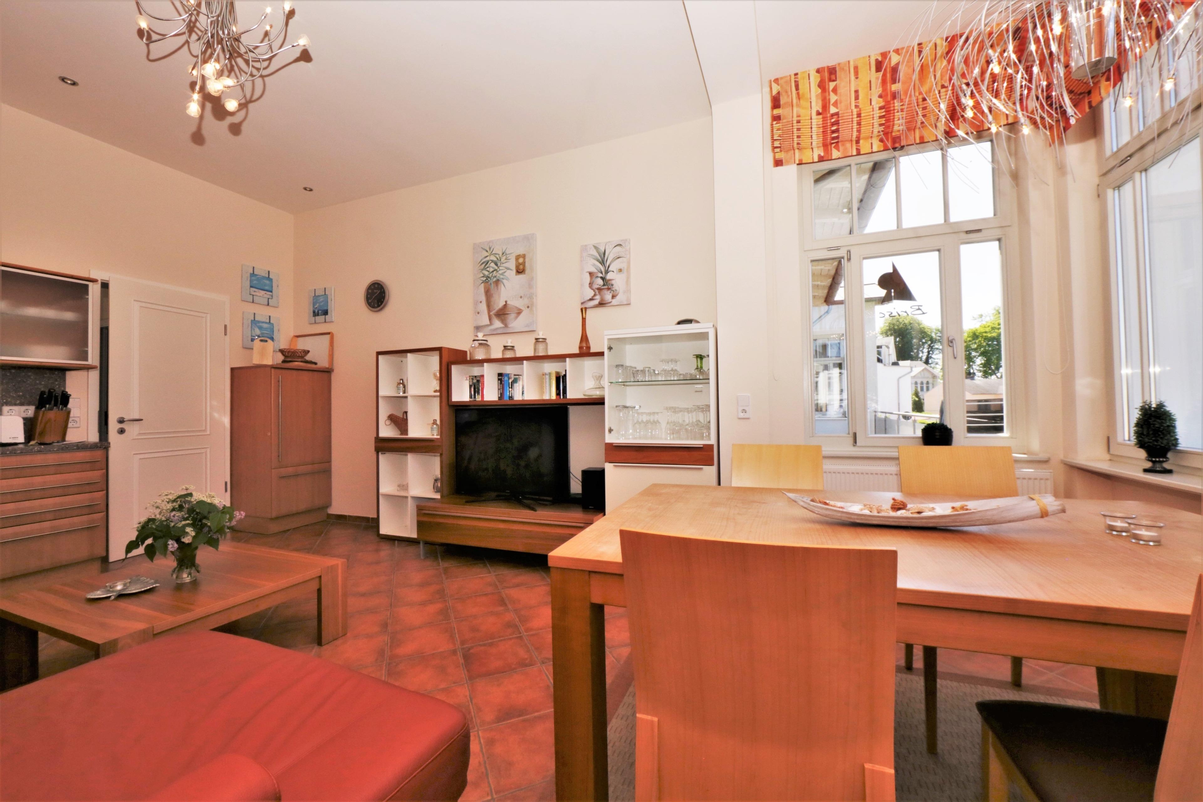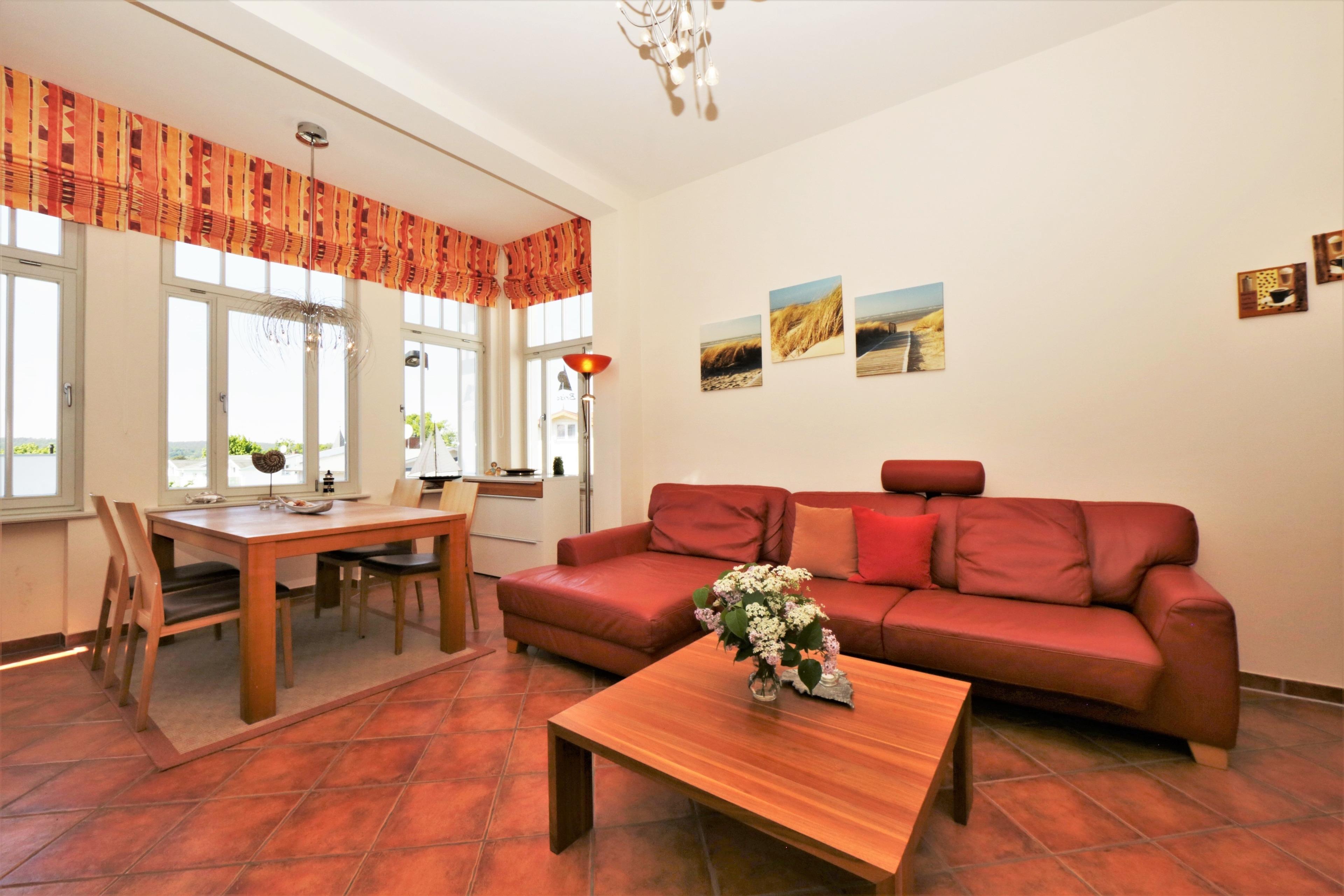 Dieses Zwei-Zimmer-Appartement mit 53 qm Wohnfläche bietet 2-3 Personen Platz für einen angenehmen Inselaufenthalt. Der großzügige Wohnbereich ist mit einer gemütlichen Sitzecke mit Schlaffunktion und FlatTV eingerichtet. Die moderne Vollküche incl. Geschirrspüler, Ceranfeld, Backofen, Kühlschrank etc. ist offen im Wohnraum integriert. Die großzügige offene Loggia beherbergt den Essplatz. Hier bleiben Sie nach den Mahlzeiten gerne noch ein wenig länger sitzen. Einen Blick auf die Ostsee können Sie von hier auch erhaschen. Im Schlafzimmer finden Sie ein Doppelbett mit getrennten Matratzen (90 x 200) und genügend Schrankraum. Das Bad bietet sowohl Dusche mit Echtglasabtrennung als auch Badewanne und Doppelwaschbecken/WC. Ein Balkon in südöstlicher Ausrichtung lockt die Gäste schon zum Frühstück ins Freie. Der Pkw- Stellplatz befindet sich auf dem Grundstück und ist der Wohnung zugeordnet. Waschmaschine und Trockner finden Sie im Keller. In diesem Appartement sind Haustiere willkommen.