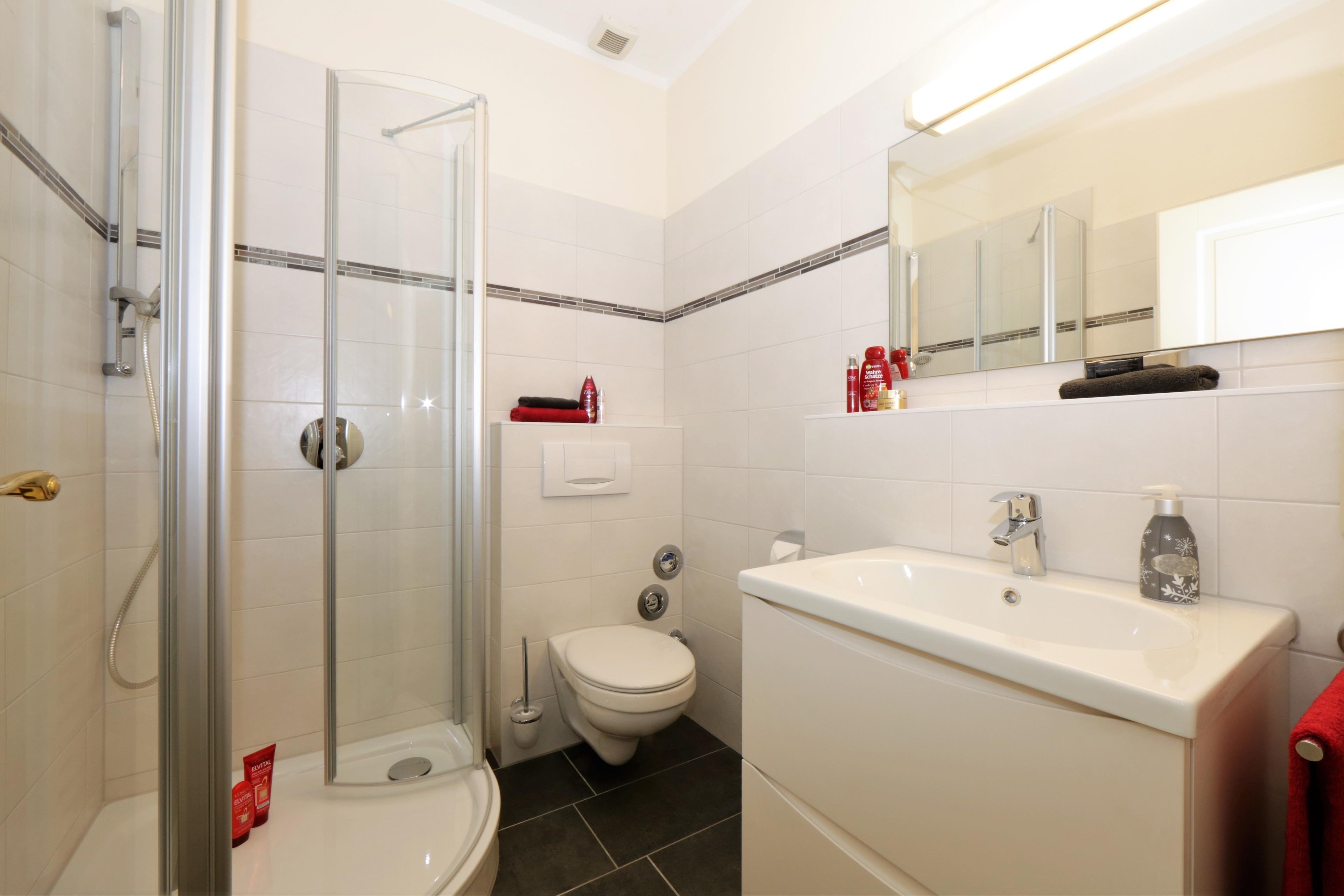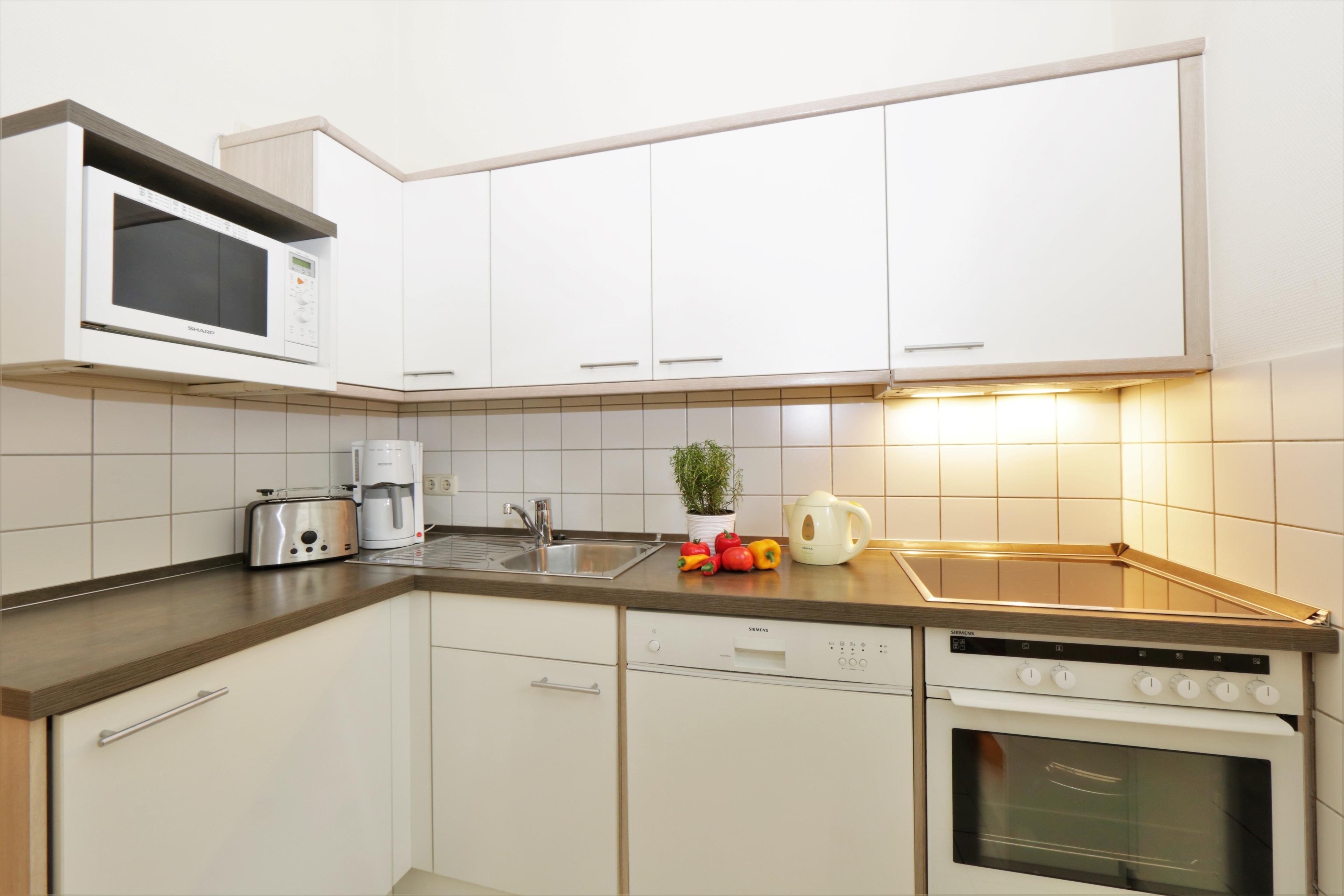 Diese Zwei-Zimmer-Wohnung bietet Ihnen allen Komfort, den Sie sich für Ihren Ferienaufenthalt wünschen. Das Wohnzimmer verfügt über eine gemütliche Couchecke (mit Schlaffunktion) und einen Essplatz für 4 Personen. Die separate Vollküche ist mit Geschirrspüler, Mikrowelle, p.p. ausgestattet. Im Schlafzimmer finden Sie ein Doppelbett und genügend Schrankraum. Im funktionellen Bad (ohne Fenster) finden Sie Waschtisch/WC und Dusche. Zwei Balkone laden zum Verweilen ein. Der PKW-Stellplatz ist am Haus. Waschmaschine, Trockner und Fahrradabstellmöglichkeit befinden sich im Keller. Die eigenen oder geliehenen Fahrräder können aber auch auf dem Grundstück in einer überdachten Abstellmöglichkeit untergebracht werden.