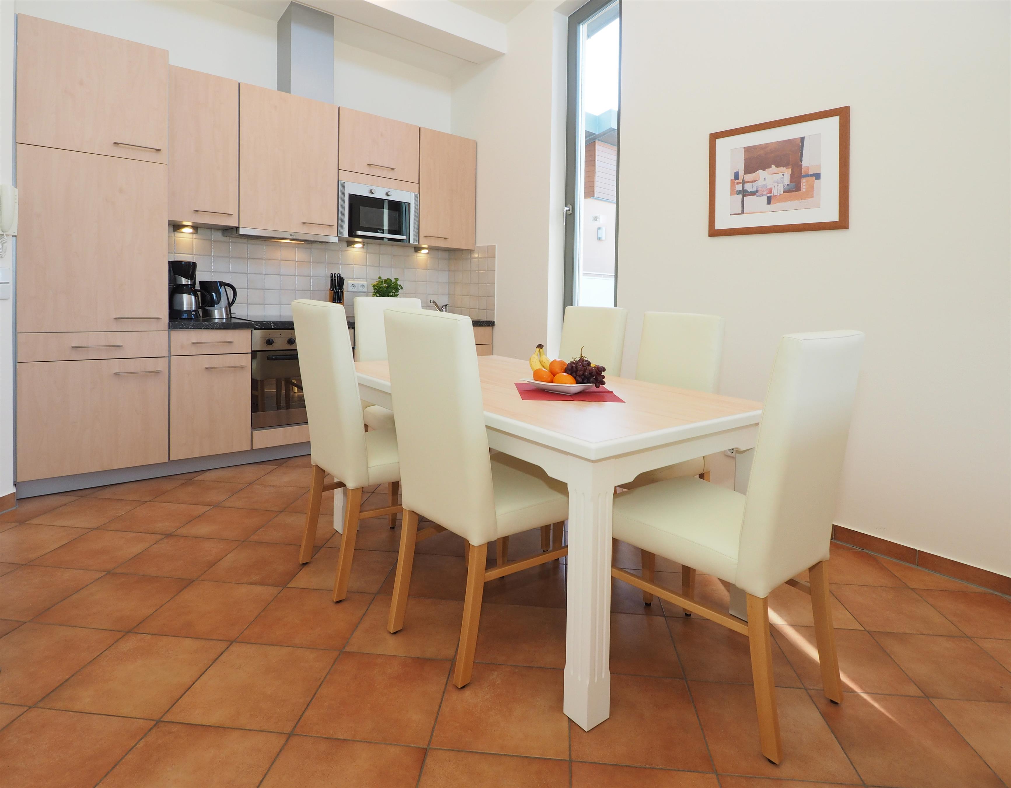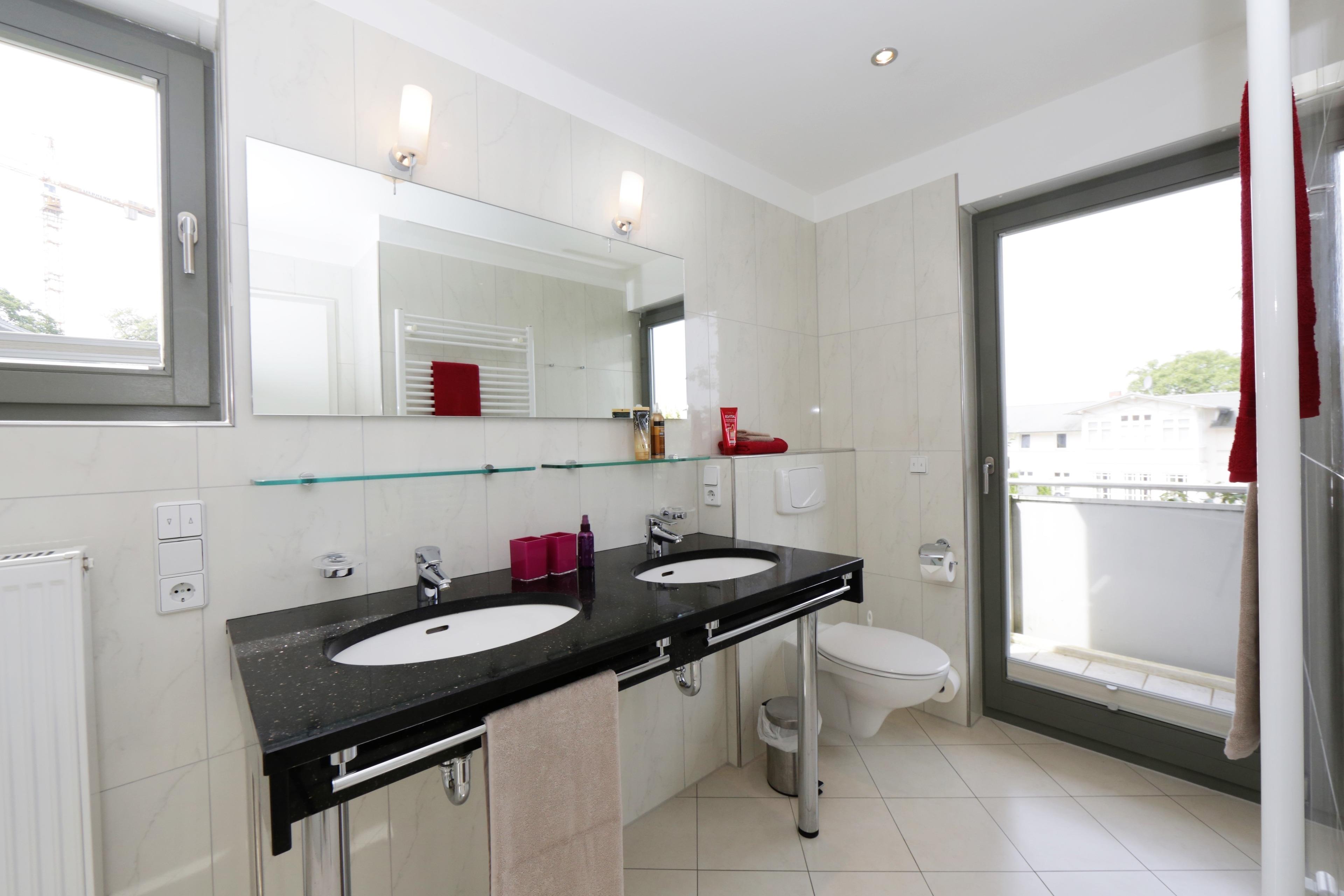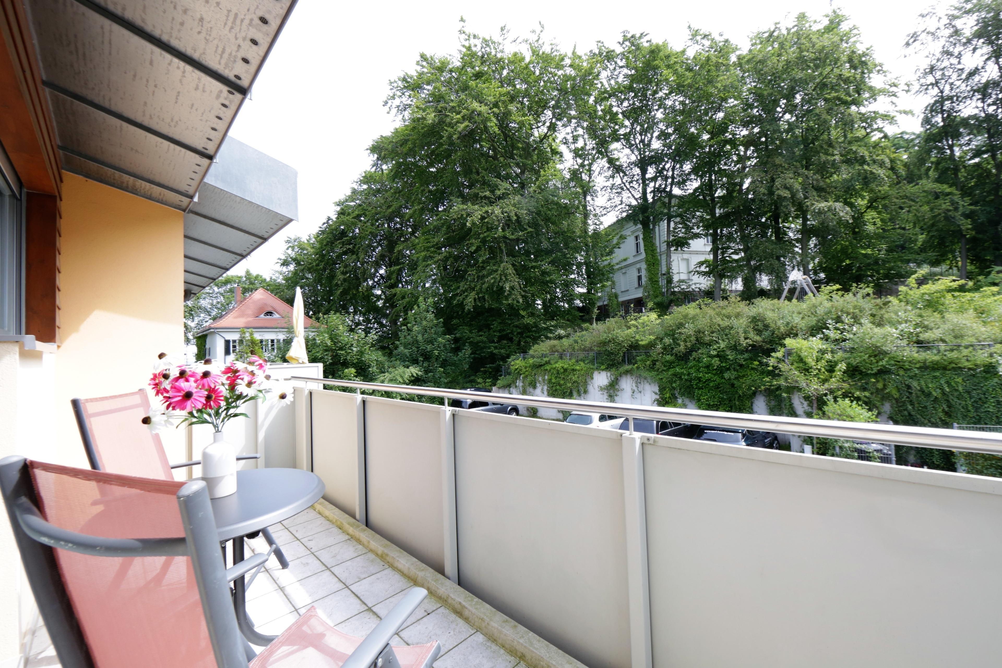 Dieses moderne 4-Zimmer-Appartement mit reichlich Fenstern und einer Größe von 108 m² erstreckt sich über zwei Ebenen. Maximal 6 Personen können hier erholsame Ferien verleben. Im Erdgeschoss befinden sich zwei Schlafzimmer, die jeweils mit einem Doppelbett mit getrennten Matratzen (90 bzw. 80 x 200) und Kleiderschrank eingerichtet sind. Über eine Treppe gelangt man in den großzügigen Wohnbereich, der mit einer komfortablen Ledergarnitur, Flat TV, Musikanlage und Kamin eingerichtet ist. Von dem großen möblierten Balkon in westlicher Ausrichtung , der vom Wohnraum aus begehbar ist, können Sie die Mahlzeiten ebenso genießen wie den traumhaften Blick über die Dächer von Heringsdorf bis auf die Ostsee. Eine moderne Küche mit Geschirrspüler, Cerankochfeld, Backofen, Mikrowelle etc. mit angrenzendem Essplatz ist ebenso im Wohnraum integriert. Das dritte Schlafzimmer, ebenfalls im oberen Bereich, ist mit einem Doppelbett (140 x 200) und ein wenig Stauraum eingerichtet. Zwei weitere möblierte Balkone zur Morgen- bzw. Abendsonne grenzen an zwei der Schlafzimmer. Jedem der Schlafzimmer ist ein Bad zugeordnet, ausgestattet mit Dusche und Waschtisch/WC. Zusätzlich bietet das größere Bad einen Doppelwaschtisch, Badewanne und Bidet. Ihnen stehen 2 PKW-Stellplätze vor dem Appartement zur Verfügung. Waschmaschine, Trockner und Fahrradkeller befinden sich im Nachbargebäude. Im Winterhalbjahr steht den Gästen an verschiedenen Tagen eine Sauna zur kostenfreien Nutzung im Haus bereit.