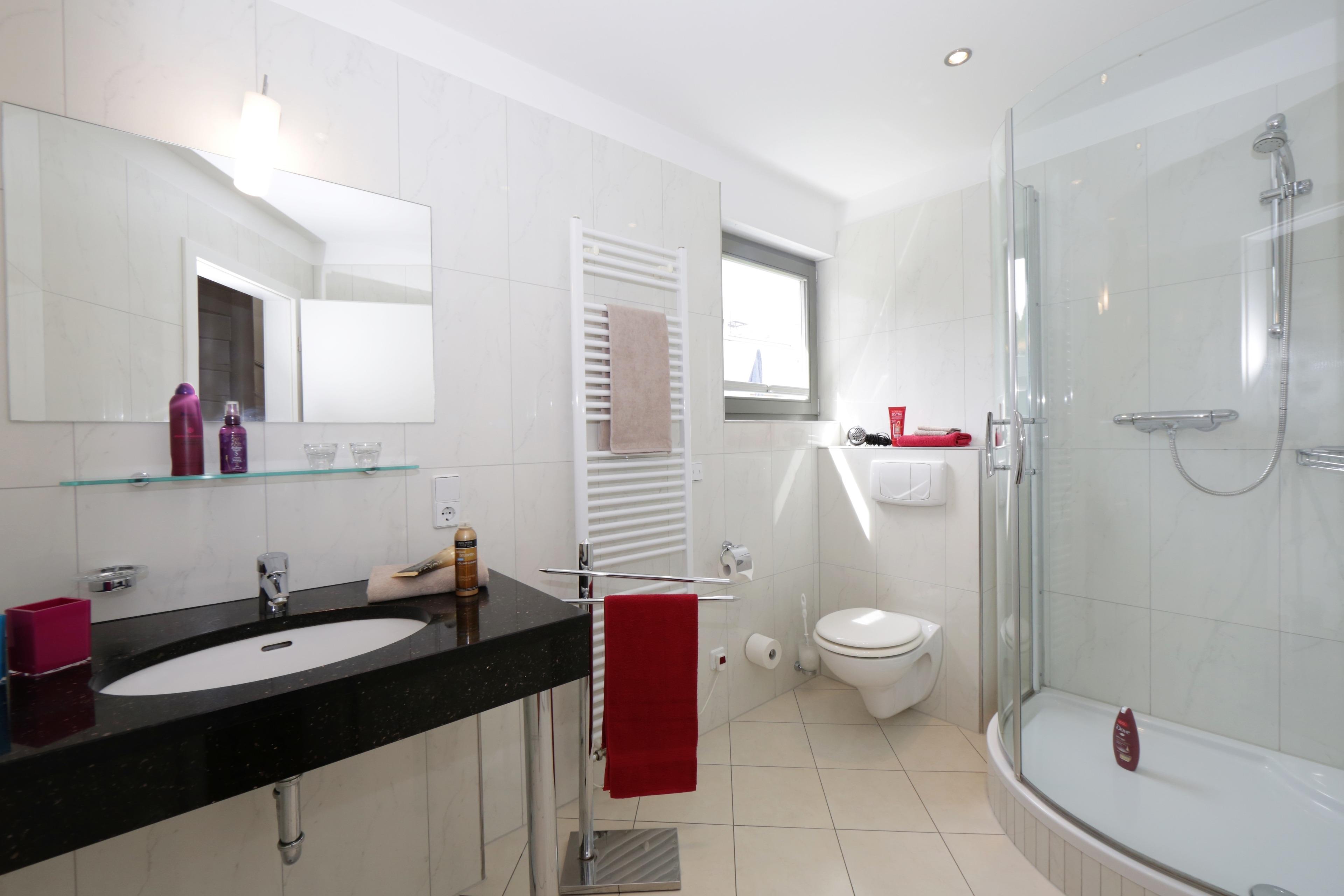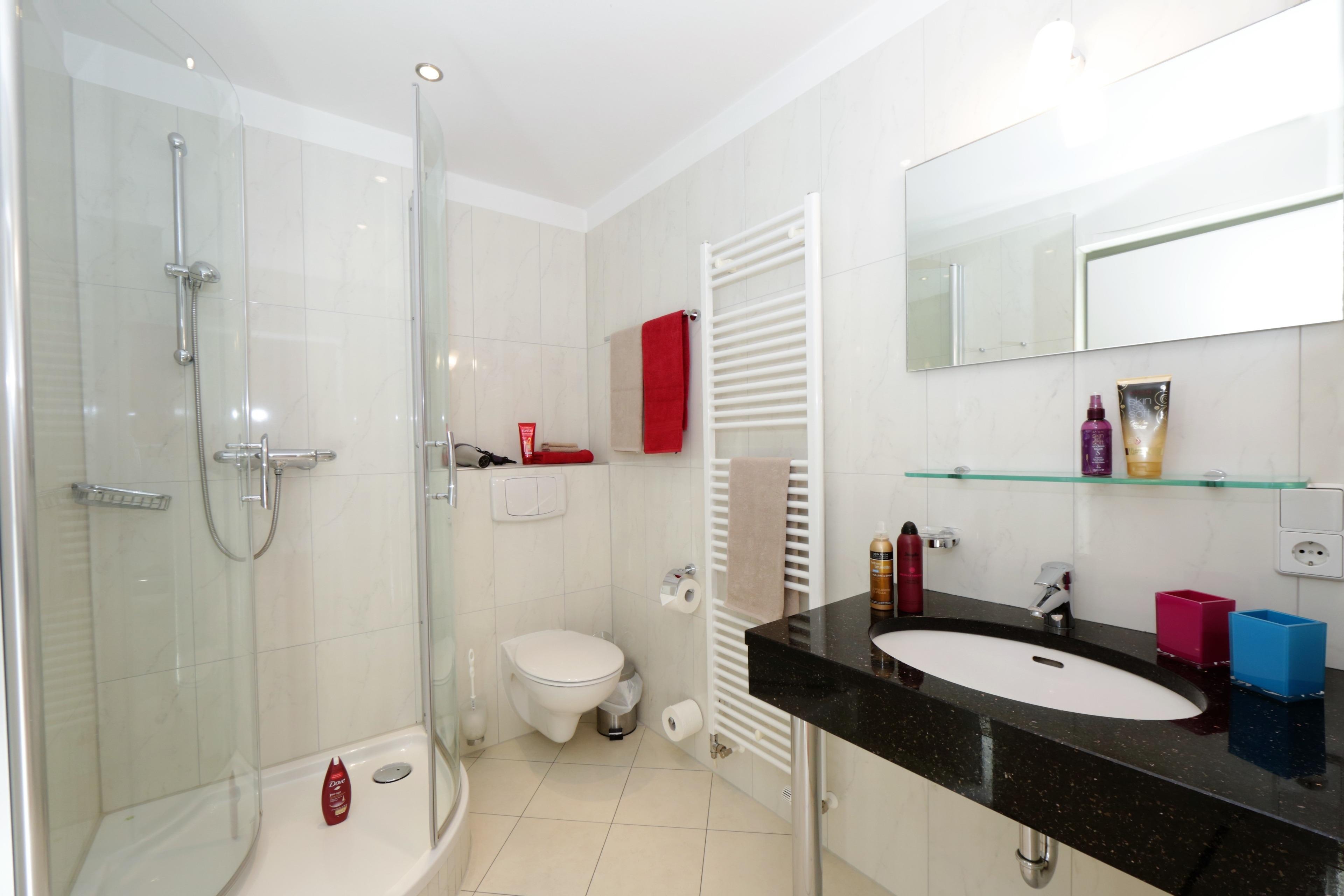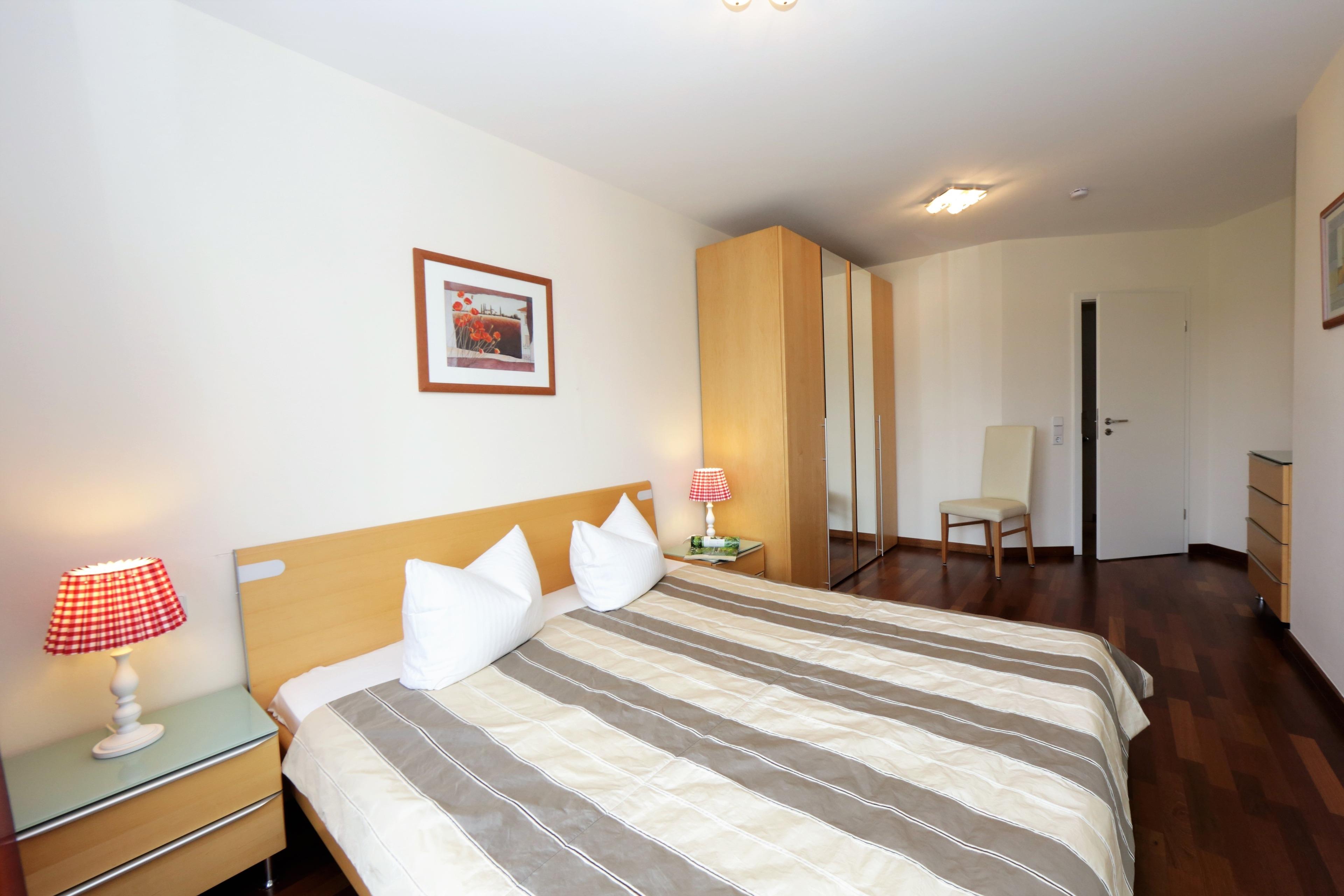 Dieses moderne 4-Zimmer-Appartement mit reichlich Fenstern und einer Größe von 108 m² erstreckt sich über zwei Ebenen. Maximal 6 Personen können hier erholsame Ferien verleben. Im Erdgeschoss befinden sich zwei Schlafzimmer, die jeweils mit einem Doppelbett mit getrennten Matratzen (90 bzw. 80 x 200) und Kleiderschrank eingerichtet sind. Über eine Treppe gelangt man in den großzügigen Wohnbereich, der mit einer komfortablen Ledergarnitur, Flat TV, Musikanlage und Kamin eingerichtet ist. Von dem großen möblierten Balkon in westlicher Ausrichtung , der vom Wohnraum aus begehbar ist, können Sie die Mahlzeiten ebenso genießen wie den traumhaften Blick über die Dächer von Heringsdorf bis auf die Ostsee. Eine moderne Küche mit Geschirrspüler, Cerankochfeld, Backofen, Mikrowelle etc. mit angrenzendem Essplatz ist ebenso im Wohnraum integriert. Das dritte Schlafzimmer, ebenfalls im oberen Bereich, ist mit einem Doppelbett (140 x 200) und ein wenig Stauraum eingerichtet. Zwei weitere möblierte Balkone zur Morgen- bzw. Abendsonne grenzen an zwei der Schlafzimmer. Jedem der Schlafzimmer ist ein Bad zugeordnet, ausgestattet mit Dusche und Waschtisch/WC. Zusätzlich bietet das größere Bad einen Doppelwaschtisch, Badewanne und Bidet. Ihnen stehen 2 PKW-Stellplätze vor dem Appartement zur Verfügung. Waschmaschine, Trockner und Fahrradkeller befinden sich im Nachbargebäude. Im Winterhalbjahr steht den Gästen an verschiedenen Tagen eine Sauna zur kostenfreien Nutzung im Haus bereit.