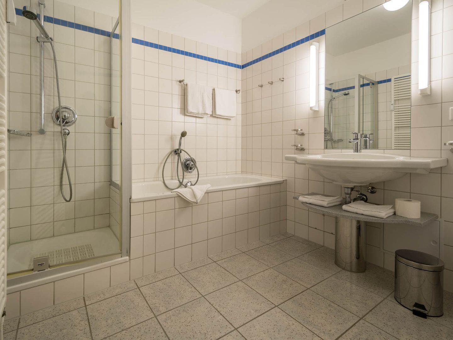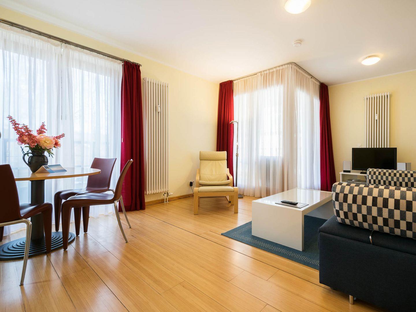 Dieses stilvoll eingerichtete Appartement überzeugt mit einem privaten Balkon. Die Küche ist voll ausgestattet und bietet neben einem Backofen mit Cerankochfeld, einen Geschirrspüler, eine Mikrowelle, einen Wasserkocher, eine Kaffeemaschine und einen Toaster. Im Wohnzimmer finden sich der LED-TV, der DVD-Player und die Musikanlage. Das Schlafzimmer liegt separat und bietet ein Doppelbett. Das Badezimmer überzeugt mit einer Badewanne, einer Dusche, einem Waschbecken, einem WC sowie einem großen Spiegel.
