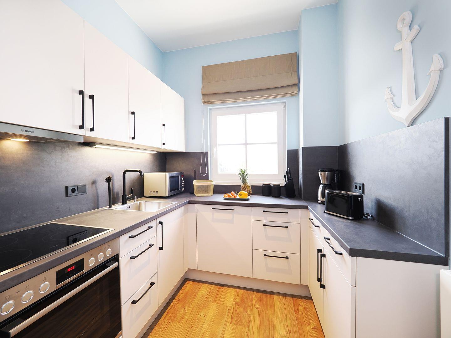 1-Raum Ferienwohnung mit Balkon, Bad mit Dusche, Küche mit Cerankochfeld, Backofen, Kühl-Gefrierkombination, Geschirrspüler und Mikrowelle, Smart-TV, Eckschlafsofa und Boxspringdoppelbett, Nichtraucher, Haustiere gestattet