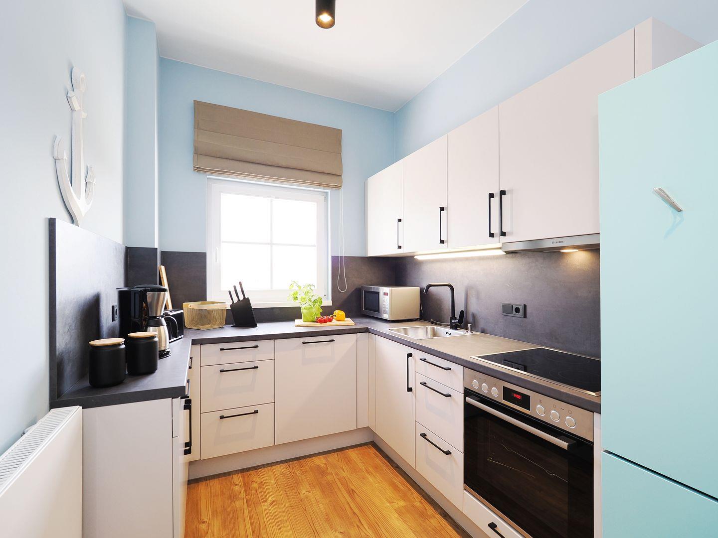 1-Raum Ferienwohnung mit Balkon, Bad mit Dusche, Küche mit Cerankochfeld, Backofen, Kühl-Gefrierkombination, Geschirrspüler und Mikrowelle, Smart-TV, Eckschlafsofa und Boxspringdoppelbett, Nichtraucher, Haustiere gestattet