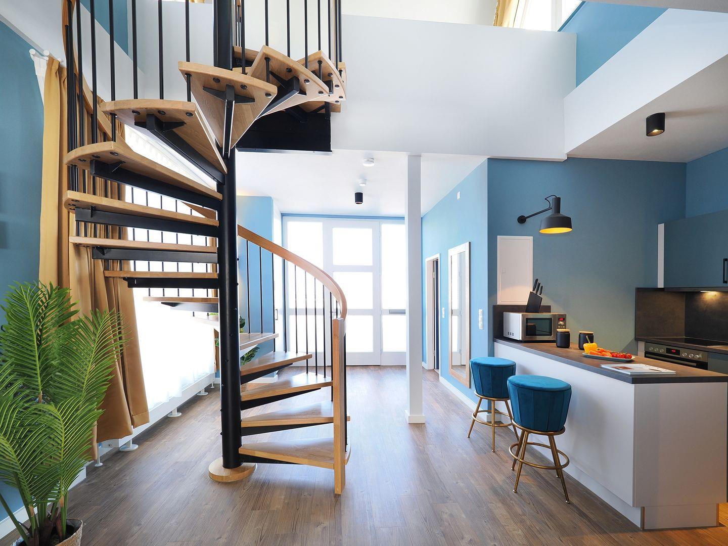 Entspannen Sie auf Ihrem privaten Balkon auf der Seebrücke Heringsdorf! Die 2023 renovierte, lichtdurchflutete 3-Raum Ferienwohnung ist auf zwei Ebenen konzipiert. Beide Schlafzimmer liegen auf der oberen Empore und sind vom darunter liegenden Wohnbereich aus über eine Wendeltreppe zu erreichen. In jedem der beiden Schlafzimmer sorgt ein Doppelboxspringbett für erholsamen Schlaf. Das Turmschlafzimmer hat neben dem Smart TV auch einen direkten Ausgang zum Balkon, wo Sie den herrlichen Weitblick auf die Ostsee haben. Im Wohnzimmer finden Sie genügend Einbauschränke für Ihre Garderobe und die bequeme Eckschlafcouch sorgt für kuschelige Gemütlichkeit. Über den großen Smart-TV können Sie am Abend die Fotos des Tages betrachten oder Ihre Lieblingsmusik hören. Der sich dem Wohnbereich unmittelbar anschließende, offene Küchenbereich mit dem großzügigen Essplatz ist mit Ceranfeld, Backofen, Geschirrspüler, Kühl-Gefrierkombination, Spülmaschine, Toaster, Mikrowelle, Wasserkocher und alle erforderliche Küchenutensilien ausgestattet. Das Badezimmer überzeugt mit einer ebenerdigen Dusche, einem Waschbecken und WC sowie einem großen Spiegel mit Kosmetikspiegel. Für Ihren Komfort sind Bettwäsche, Handtücher, Reinigungs- und Waschmittel als Erstausstattung inklusive. Vom Wohnbereich haben einen direkten Ausgang auf die Terrasse mit Sitzgarnitur, wo Sie den Sonnenaufgang genießen können. Der WLAN-Zugang ist kostenfrei nutzbar. Auf Wunsch stellen wir ein Kinderreisebett und einen Kinderhochstuhl gegen einen Aufpreis zur Verfügung. Vor dem Haus gibt es nur Be- und Endladeparkplätze, als Alternative bieten wir für das örtliche Parkhaus in Heringsdorf ermäßigte Parkkarten gemäß aktueller Preise. Die Parkkarte erhalten Sie bei Anreise in unserem Servicebüro. Haustiere sind in dieser Ferienwohnung herzlich willkommen, hierfür berechnen wir Gebühr gemäß aktueller Preise. Im Untergeschoss der Seebrücke steht Ihnen ein abschließbarer Fahrradraum sowie ein kleiner Waschraum mit Waschmaschine, Trockner, Bügelbrett und Bügeleisen kostenfrei zur Verfügung.