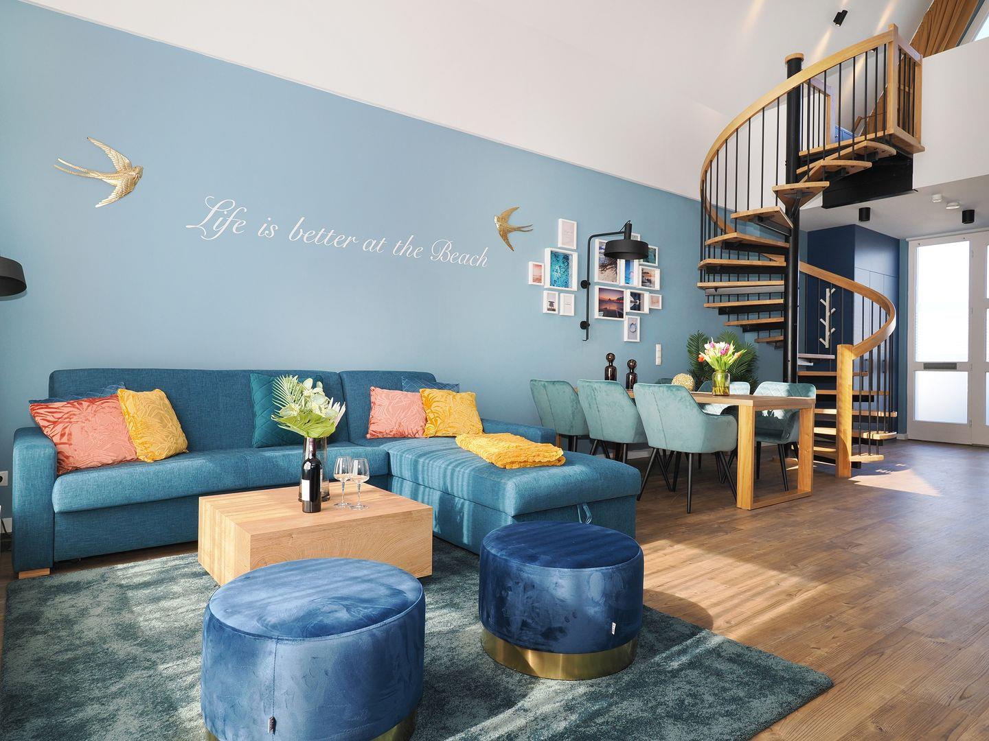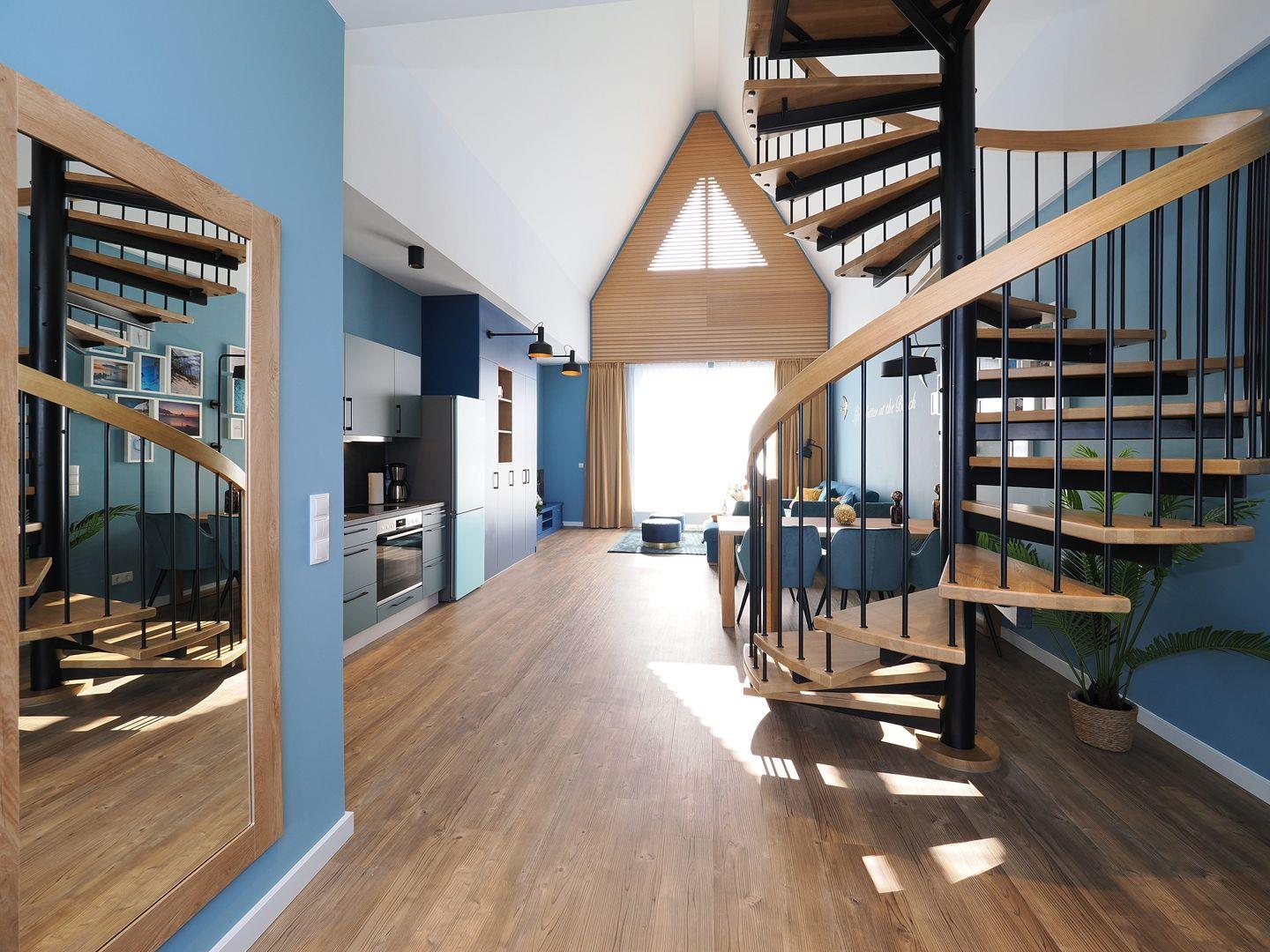 2-Raum Ferienwohnung mit Empore und Terrasse, Bad mit Dusche, Küche mit Cerankochfeld, Backofen, Kühl-Gefrierkombination, Geschirrspüler und Mikrowelle, Smart-TV, Eckschlafsofa und Boxspringdoppelbett, Nichtraucher, Haustiere gestattet