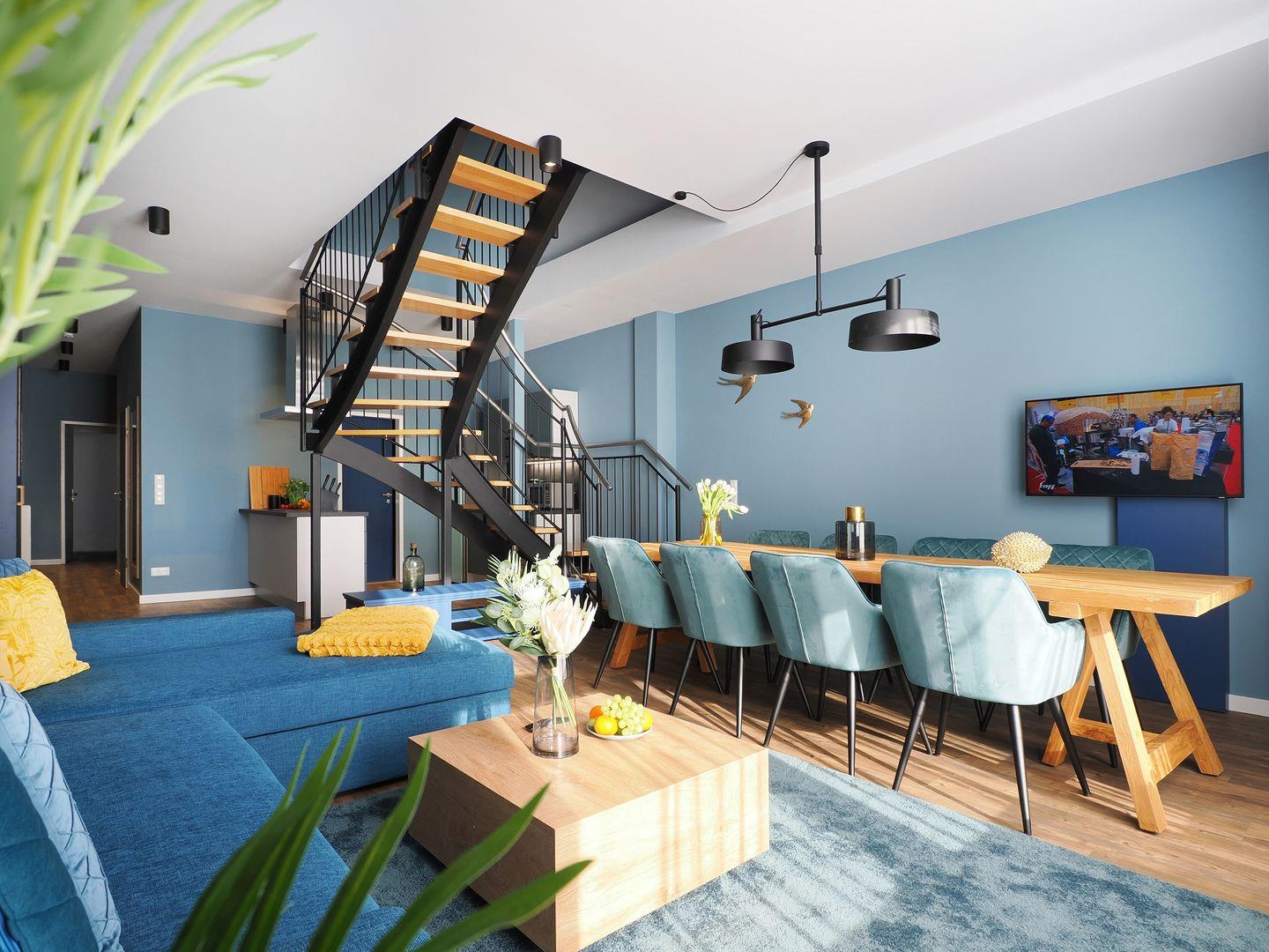 Entspannen Sie auf der Seebrücke Heringsdorf! Die 2023 renovierte, lichtdurchflutete 3-Raum Ferienwohnung ist auf zwei Ebenen konzipiert. Beide Schlafzimmer liegen auf der oberen Etage und sind vom darunter liegenden Wohnbereich aus über eine Treppe zu betreten. In jedem der beiden Schlafzimmer sorgt ein Doppelboxspringbett für erholsamen Schlaf. Im Wohnzimmer finden Sie genügend Einbauschränke für Ihre Garderobe und die bequeme Eckschlafcouch sorgt für kuschelige Gemütlichkeit. Über den großen Smart-TV können Sie am Abend die Fotos des Tages betrachten oder Ihre Lieblingsmusik hören. Der sich dem Wohnbereich unmittelbar anschließende, offene Küchenbereich mit dem großzügigen Essplatz ist mit Ceranfeld, Backofen, Geschirrspüler, Kühlschrank mit Gefrierfach, Spülmaschine, Toaster, Mikrowelle, Wasserkocher und alle erforderliche Küchenutensilien ausgestattet. Das Badezimmer überzeugt mit einer Badewanne und ebenerdiger Dusche, Waschbecken und WC sowie einem großen Spiegel mit Kosmetikspiegel. Ein Gäste-WC ist auch vorhanden. Für Ihren Komfort sind Bettwäsche, Handtücher, Reinigungs- und Waschmittel als Erstausstattung inklusive. Vom Wohnbereich über den Flur gelangen Sie auf die Terrasse mit Sitzgarnitur, wo Sie den Sonnenaufgang genießen können. Der WLAN-Zugang ist kostenfrei nutzbar. Auf Wunsch stellen wir ein Kinderreisebett und einen Kinderhochstuhl gegen einen Aufpreis zur Verfügung. Vor dem Haus gibt es nur Be- und Endladeparkplätze, als Alternative bieten wir für das örtliche Parkhaus in Heringsdorf ermäßigte Parkkarten gemäß aktueller Preise. Die Parkkarte erhalten Sie bei Anreise in unserem Servicebüro. Haustiere sind in dieser Ferienwohnung herzlich willkommen, hierfür berechnen wir Gebühr gemäß aktueller Preise. Im Untergeschoss der Seebrücke steht Ihnen ein abschließbarer Fahrradraum sowie ein kleiner Waschraum mit Waschmaschine, Trockner, Bügelbrett und Bügeleisen kostenfrei zur Verfügung.