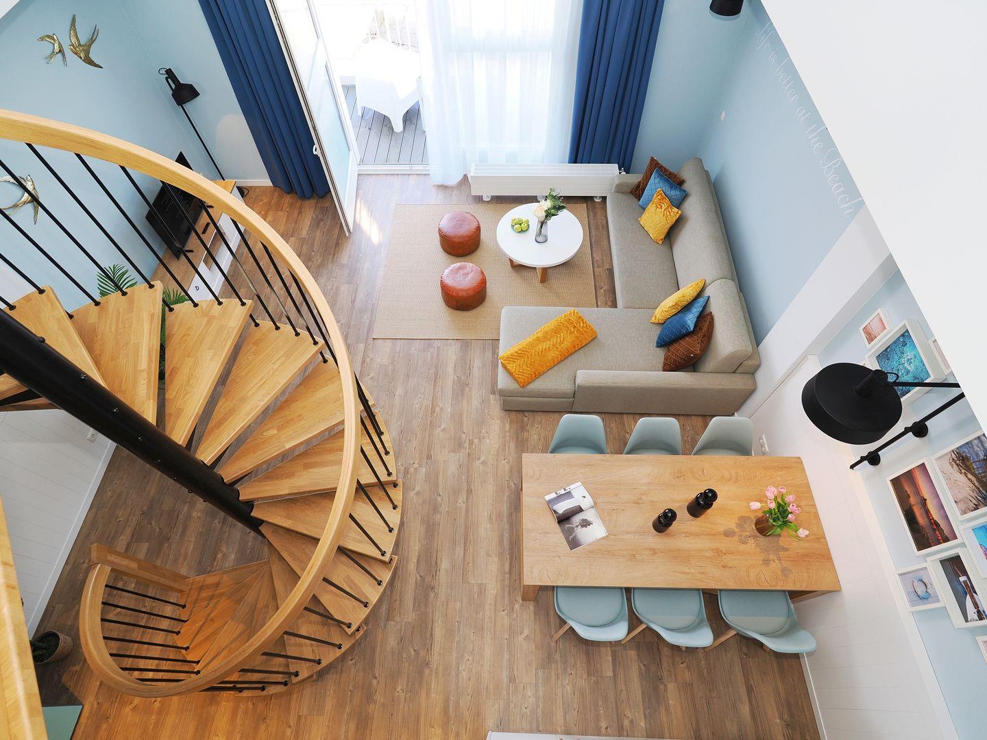2-Raum Ferienwohnung mit Empore und Balkon, Bad mit Dusche, Küche mit Cerankochfeld, Backofen, Kühl-Gefrierkombination, Geschirrspüler und Mikrowelle, Smart-TV, Eckschlafsofa und Boxspringdoppelbett, Nichtraucher, Haustiere gestattet
