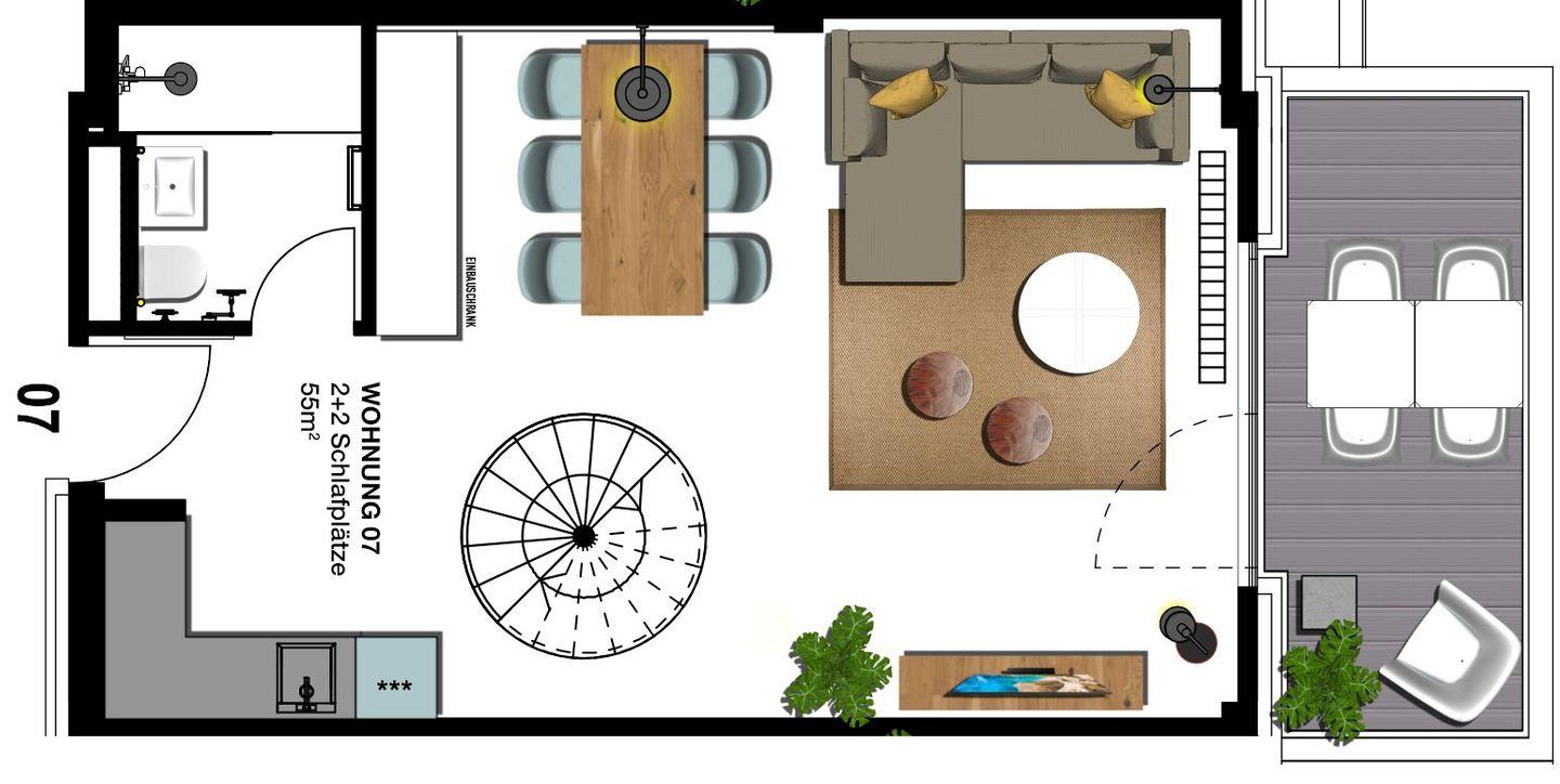 2-Raum Ferienwohnung mit Empore und Balkon, Bad mit Dusche, Küche mit Cerankochfeld, Kühl-Gefrierkombination, Geschirrspüler und Mikrowelle, Smart-TV, Eckschlafsofa und Boxspringdoppelbett, Nichtraucher, Haustiere gestattet