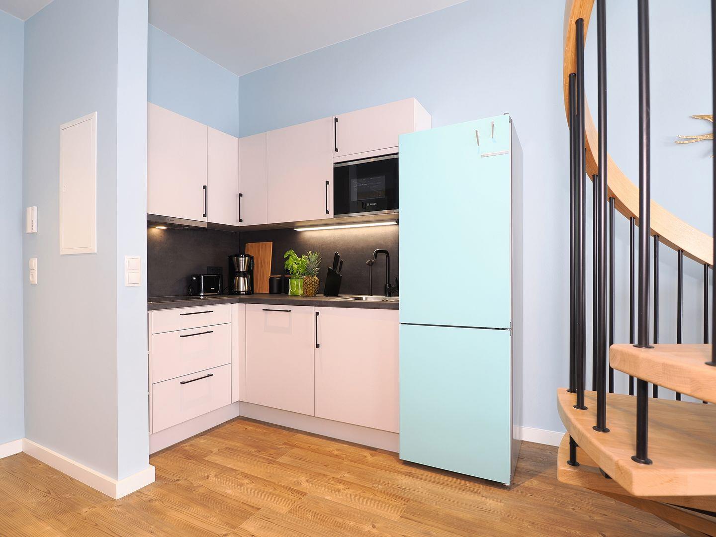 2-Raum Ferienwohnung mit Empore und Balkon, Bad mit Dusche, Küche mit Cerankochfeld, Kühl-Gefrierkombination, Geschirrspüler und Mikrowelle, Smart-TV, Eckschlafsofa und Boxspringdoppelbett, Nichtraucher, Haustiere gestattet