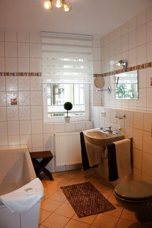 Die helle 83 m² große Ferienwohnung 01 befindet sich im Erdgeschoss des Hauses. Sie ist sehr gut ausgestattet und verfügt über ein Wohn-/Esszimmer mit großzügiger Sitzlandschaft und voll ausgestatteter Küchenzeile, zwei gemütliche Schlafzimmer (Doppelbetten), zwei Bäder (ein Duschbad, ein Bad mit