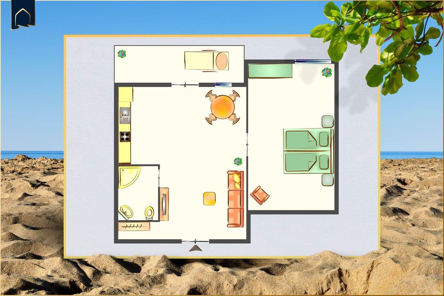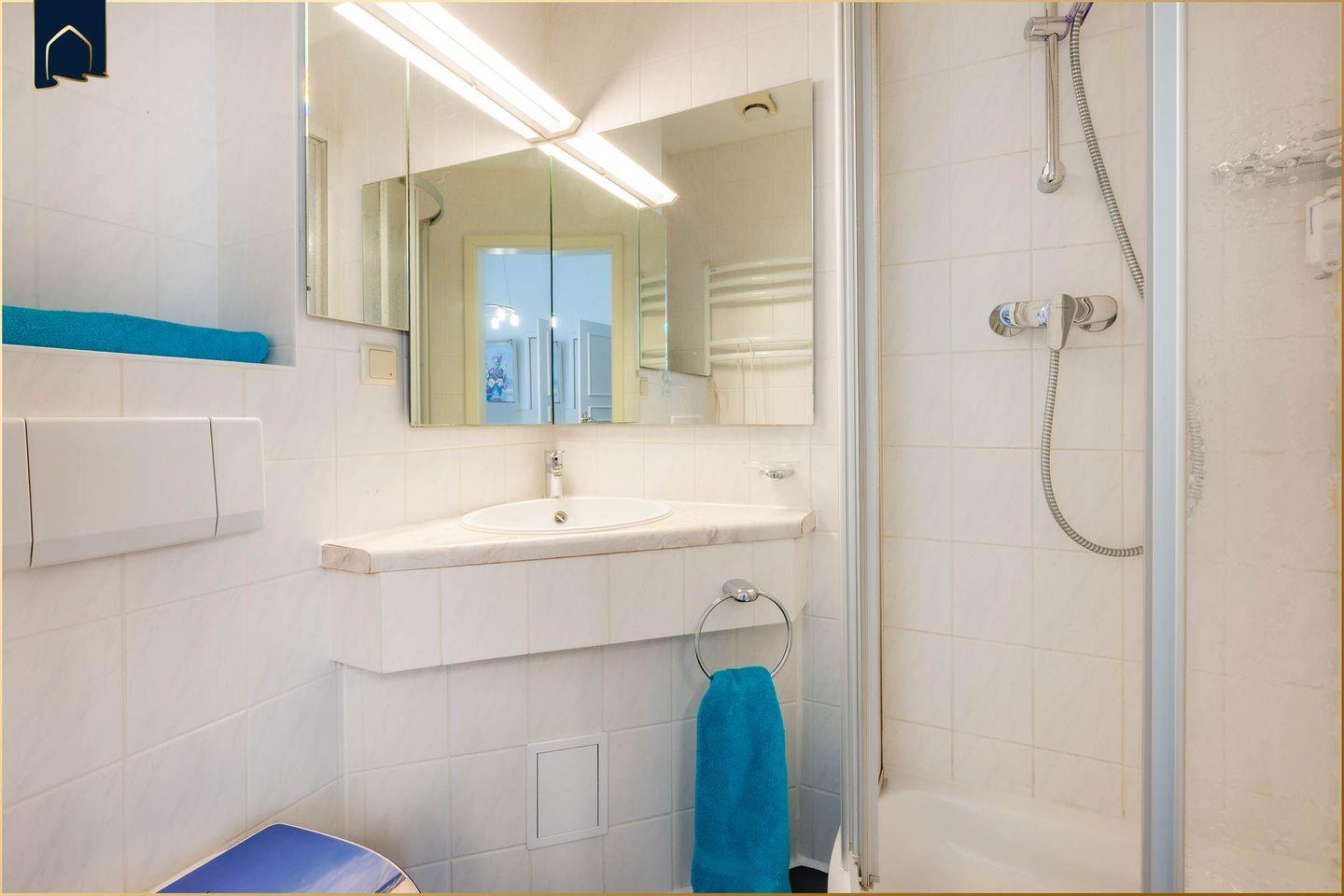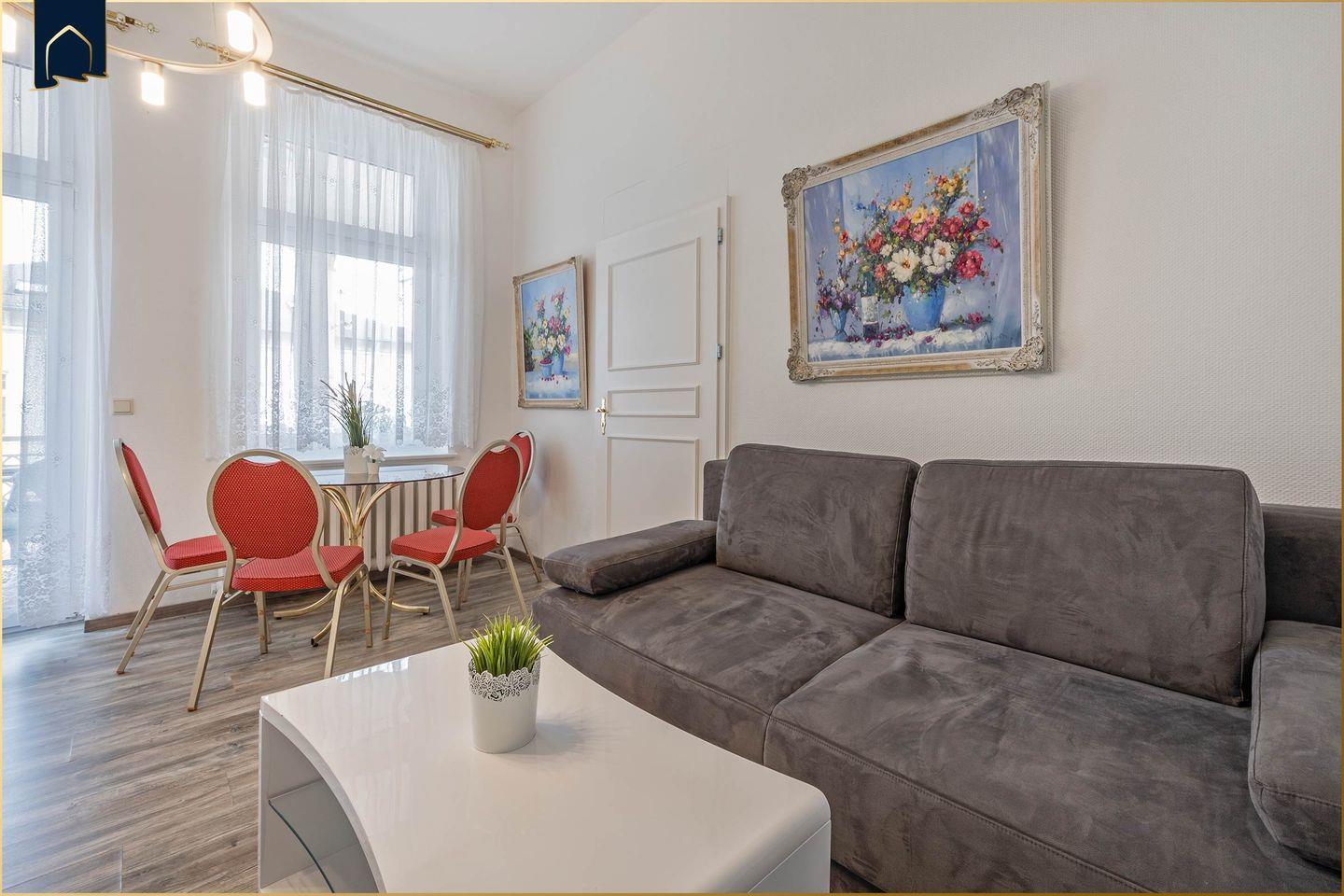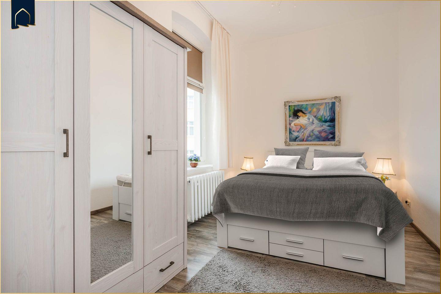 Die Wohnung verfügt über ein separates Schlafzimmer mit komfortablen Schlafmöglichkeiten für bis zu vier Personen. Im stilvoll gestalteten Badezimmer erwartet Sie eine moderne Dusche, ein Waschbecken, WC und ein Haartrockner – alles, was Sie für einen angenehmen Start in den Tag benötigen. Alle Fenster der Wohnung sind mit Sichtschutz ausgestattet, sodass Sie Ihre Privatsphäre jederzeit genießen können.
