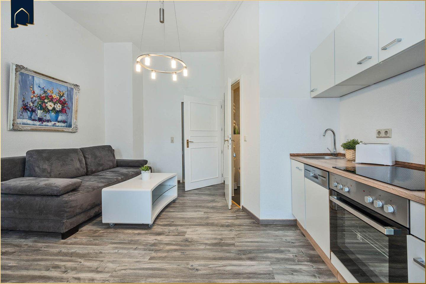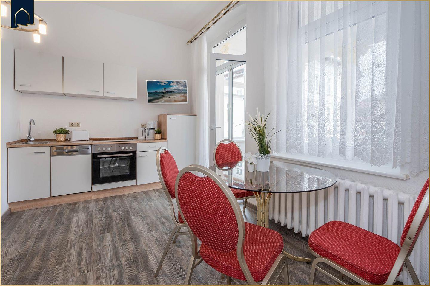 Die voll ausgestattete Küche mit Herd, Kühlschrank, Gefrierfach, Spülmaschine, Kaffeemaschine, Wasserkocher und Toaster lässt keine Wünsche offen – perfekt für Selbstversorger und Hobbyköche. Ein Esstisch bietet Platz für gemeinsame Mahlzeiten. Dank WLAN und TV bleibt auch für Unterhaltung gesorgt. Die Wohnung ist eine Nichtraucherunterkunft und auch Haustiere sind herzlich willkommen. Einkaufsmöglichkeiten, Restaurants, öffentlicher Nahverkehr und ein Geldautomat befinden sich nur wenige Schritte entfernt – so erleben Sie Urlaub ganz ohne Auto.