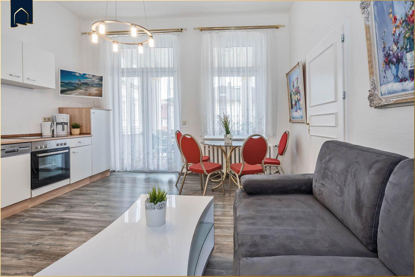 Die Villa Seeland App. 04 in Seebad Heringsdorf bietet auf 40 m² Platz für bis zu 4 Personen und ein Haustier. Die modern ausgestattete Unterkunft verfügt über ein separates Schlafzimmer, einen Wohnbereich mit Sofa, eine voll ausgestattete Küche sowie einen Balkon. WLAN, TV und zahlreiche Freizeitmöglichkeiten in unmittelbarer Nähe wie Strand, Einkaufsmöglichkeiten und Restaurants sorgen für einen angenehmen Aufenthalt.