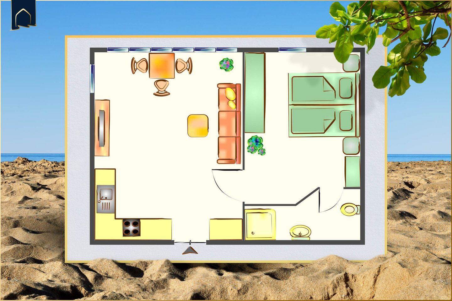Die separate Küche bietet alles, was Sie für Ihren Urlaub brauchen: ein Kühlschrank mit Gefrierfach, Herd, Mikrowelle, Kaffeemaschine, Wasserkocher, Toaster, Spülmaschine sowie Geschirr und Küchenutensilien. Auch ein Esstisch ist vorhanden, sodass Sie Ihre Mahlzeiten bequem in der Wohnung genießen können. Das Badezimmer ist mit Dusche, Waschbecken, WC und Haartrockner ausgestattet – perfekt für entspannte Morgenroutinen.