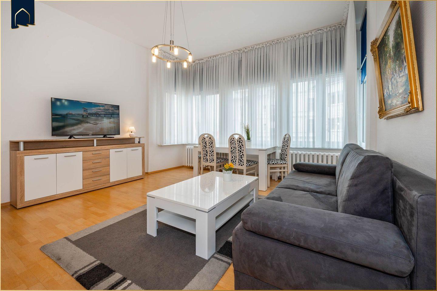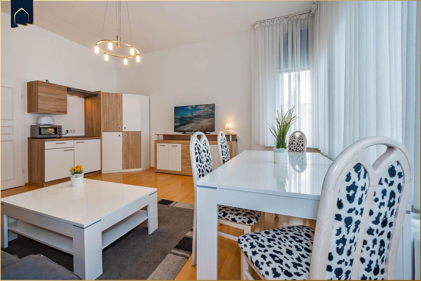 Die Wohnung überzeugt durch eine helle, freundliche Atmosphäre mit stilvoller Einrichtung. Im gemütlichen Wohnbereich lädt ein Sofa zum Verweilen ein – natürlich mit kostenfreiem WLAN und TV. Ein Ganzkörperspiegel, Sichtschutz an allen Fenstern und ein modernes Badezimmer mit Dusche sorgen für maximalen Komfort. Auch für Familien mit Kindern ist die Unterkunft bestens geeignet: Es sind bis zu 4 Schlafmöglichkeiten vorhanden.