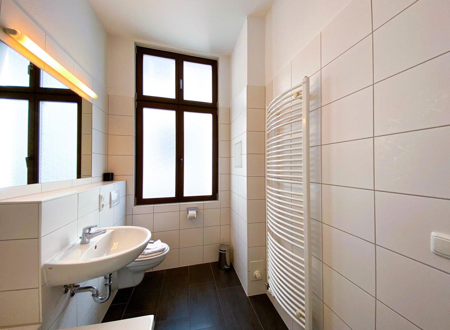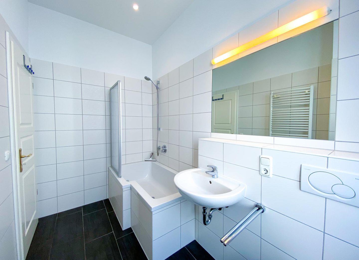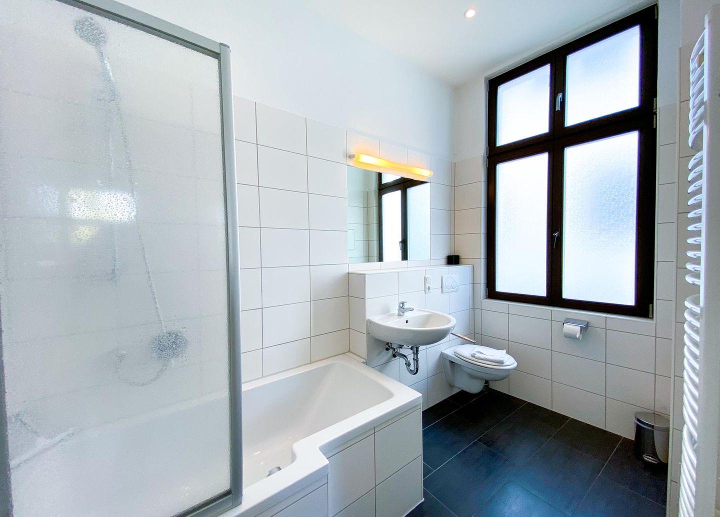Das Badezimmer wurde komplett neu renoviert und verfügt jetzt über eine schöne Wanne mit Duschvorrichtung. Durch das große Fenster fällt viel Tageslicht in den Raum hinein und kann so auch gut gelüftet werden.