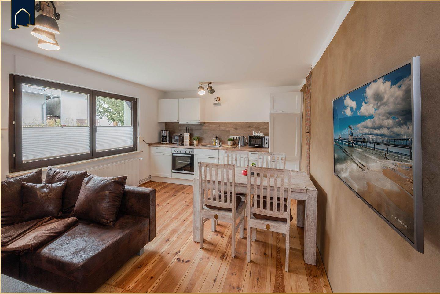 Im großzügigen Wohnzimmer mit gemütlicher Sofaecke, Esstisch und TV können Sie entspannen, Spiele spielen oder einfach abschalten. Dank kostenlosem WLAN bleiben Sie auch im Urlaub flexibel. Die Wohnung befindet sich im Erdgeschoss und hat direkten Zugang zur Terrasse und zum großen, ca. 1.700?m² umfassenden Garten – perfekt für Sonnenbäder, Grillabende oder ein gutes Buch im Schatten der Gartenlaube.