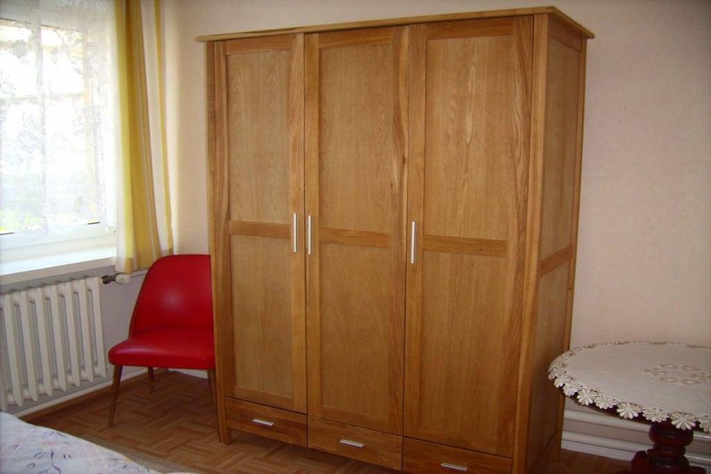 Die Ferienwohnung befindet sich unten, direkter Zugang zur Terrasse. Belegung 1- 5 Personen Im Schlafzimmer , 2 Betten und 1 Liege sowie 1 Schrank, 2 Nachttische mit Nachttischlampen. Im 2. Schlafraum 2 Liegen, 1 Schrank, Nachttische und Nachttischlampen. Reisebett und Hochstuhl können gestellt werden. Wohnzimmer mit Couchgarnitur und Fernseher, Anrichte. Küche mit E-Herd, Geschirrspüler, Kühl-und Gefrierschrank, Sitzgelegenheit Ein Bad mit Dusche und WC neu, sowie eine Waschmaschine. Ein Bügelbrett und Bügeleisen sind auch vorhanden. Terrasse mit Gartenmöbeln laden zum grillen ein. Ruhige große Hoflage für Kinder zum spielen geeignet.