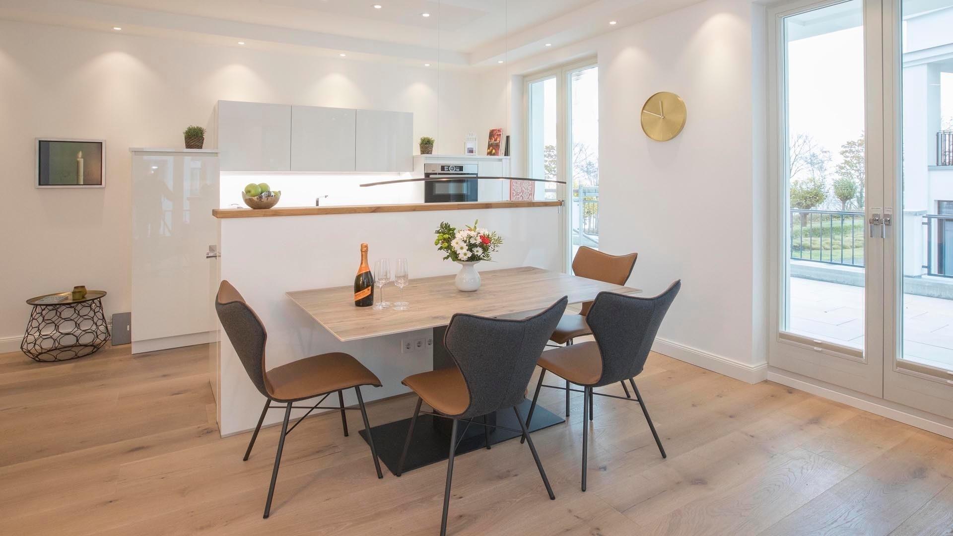 Der Wohnraum ist mit hochwertigen Möbeln von Stressless und BoConcept, Sonos und Tivoli Audio Musiksystemen, 49" Fernseher mit Smart TV und hochwertigen Assesoires ausgestattet. Der angrenzende Ess- und Küchenbereich mit einer vollwertig ausgestatteten Küche, Kochinsel, Tresen, Induktionsherd, Nespresso Expert, sowie allen technischen Geräten, die in eine Küche gehören, wird ihnen Freude beim Kochen und Essen bereiten.
