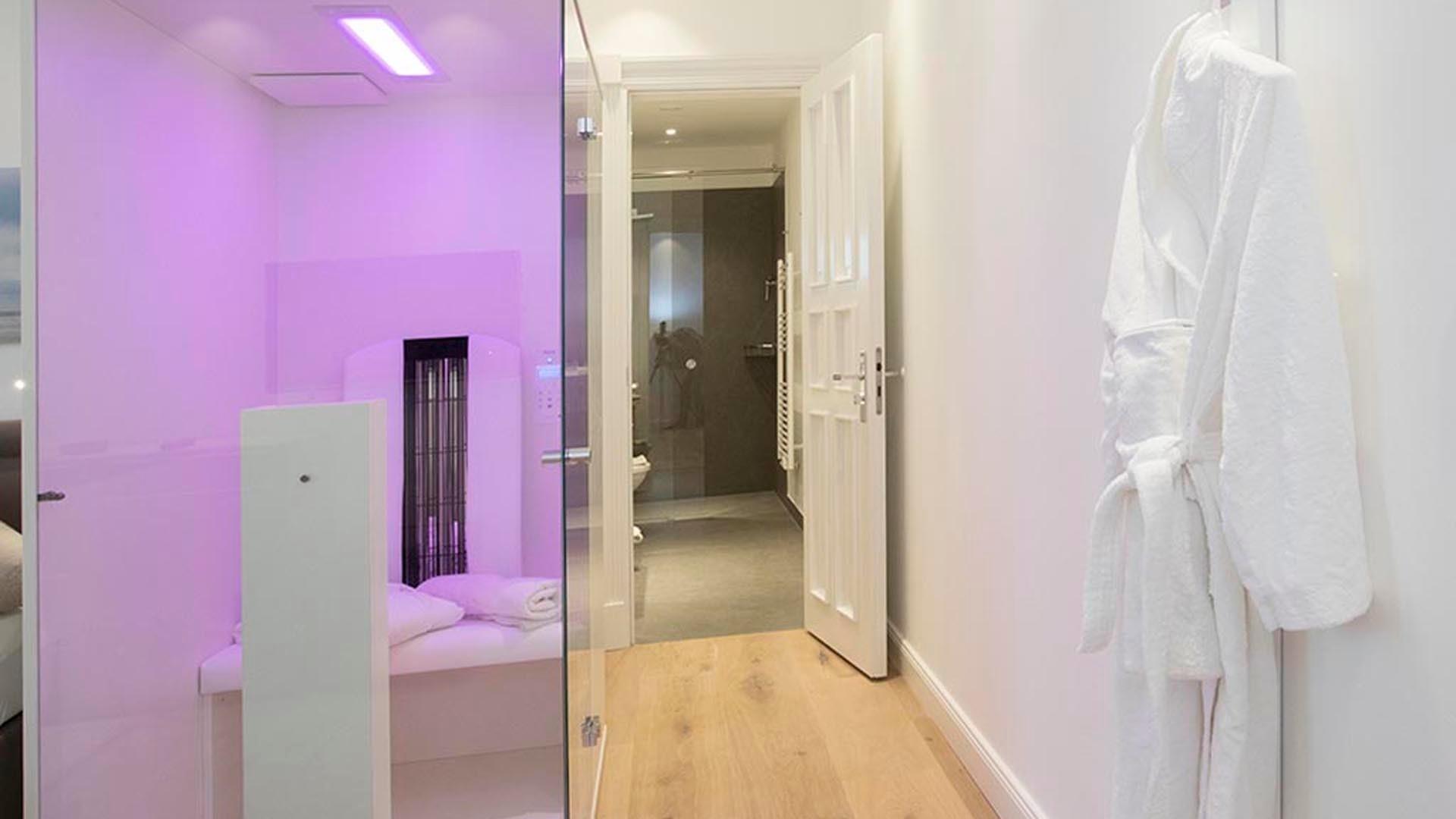Wellness pur bieten ihnen die in der Wohnung intergrierte B-Intense/Physiotherm Infrarotkabine sowie die 2 großen klassischen Panorama- Saunen und der große Panorama-Pool im 6. Stock des Hauses. Hier haben sie einen atemberaubenden Blick über das Meer, bis hin zu den Rügener Kreidefelsen und können im Indoor Wellnessbereich oder aber auf den großen Dachterrassen ihren Aufenthalt genießen. In den Sommermonaten stehen ihnen zusätzlich ein großer Dünengarten mit großem, solarbeheiztem Pool und Sonnenliegen zur Verfügung.