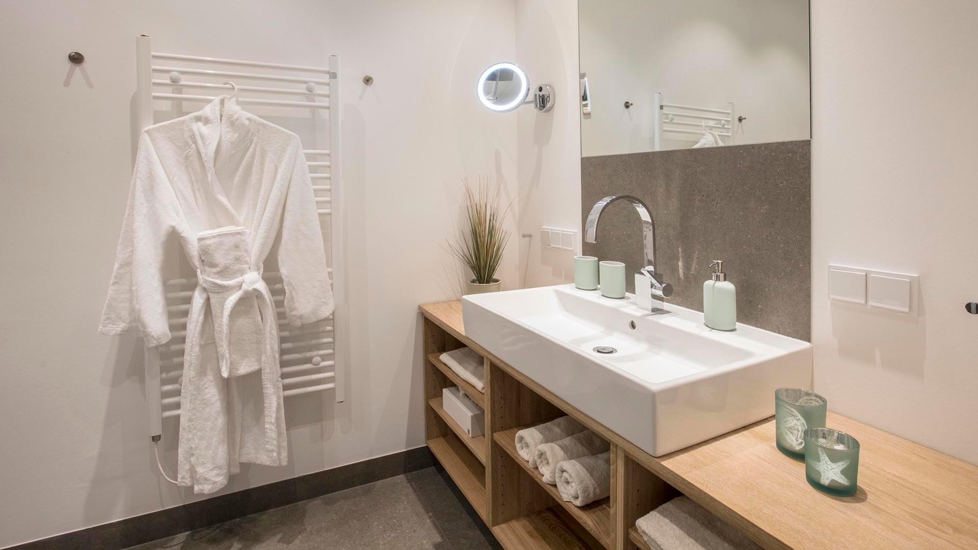Die 2 Badezimmer en suite, sind jeweils mit ebenerdiger Regendusche, Massivholz-Waschtisch und Fußbodenheizung ausgestattet.
