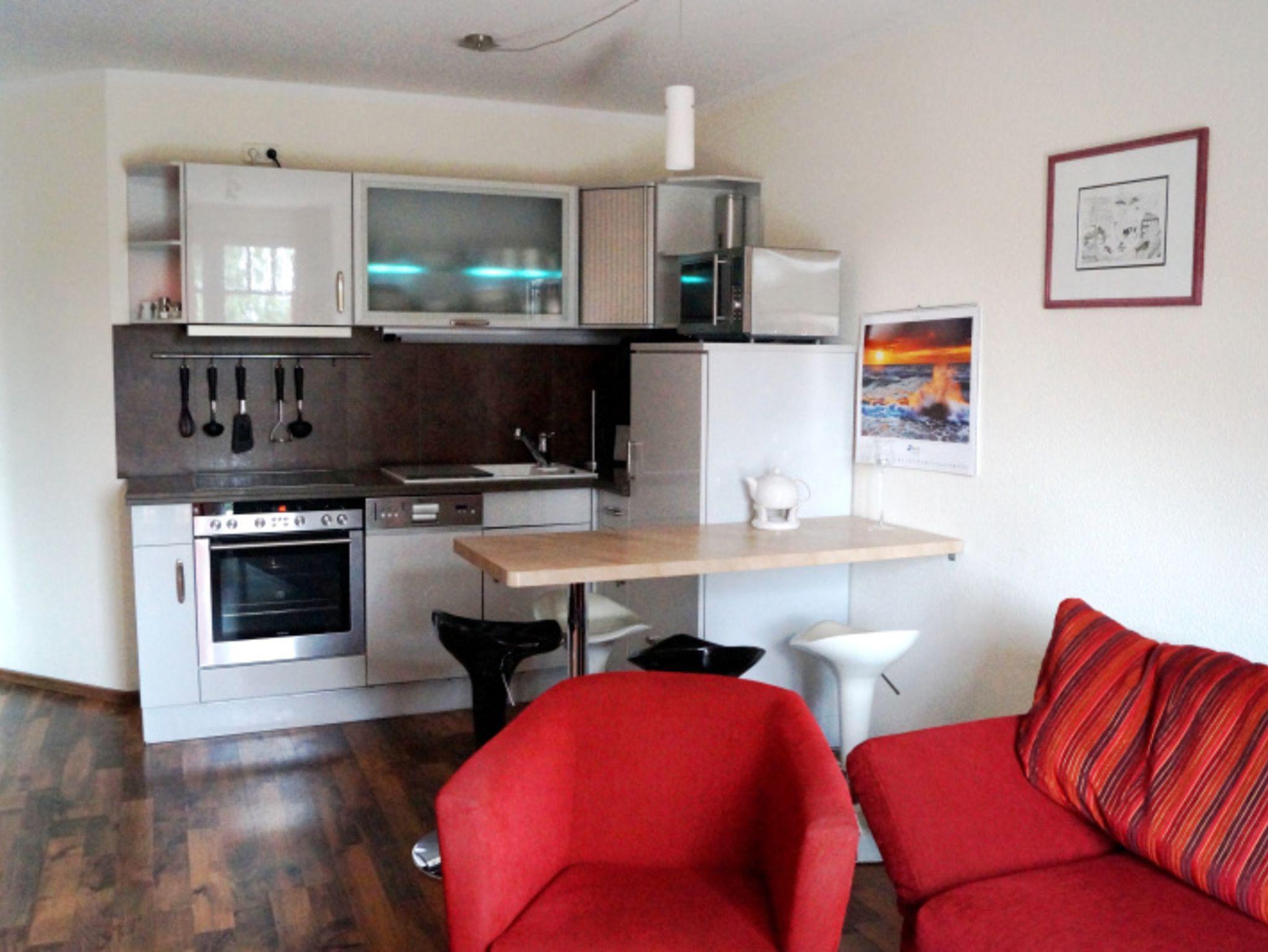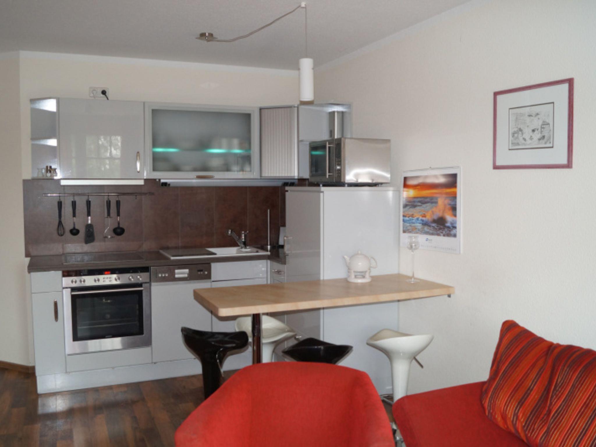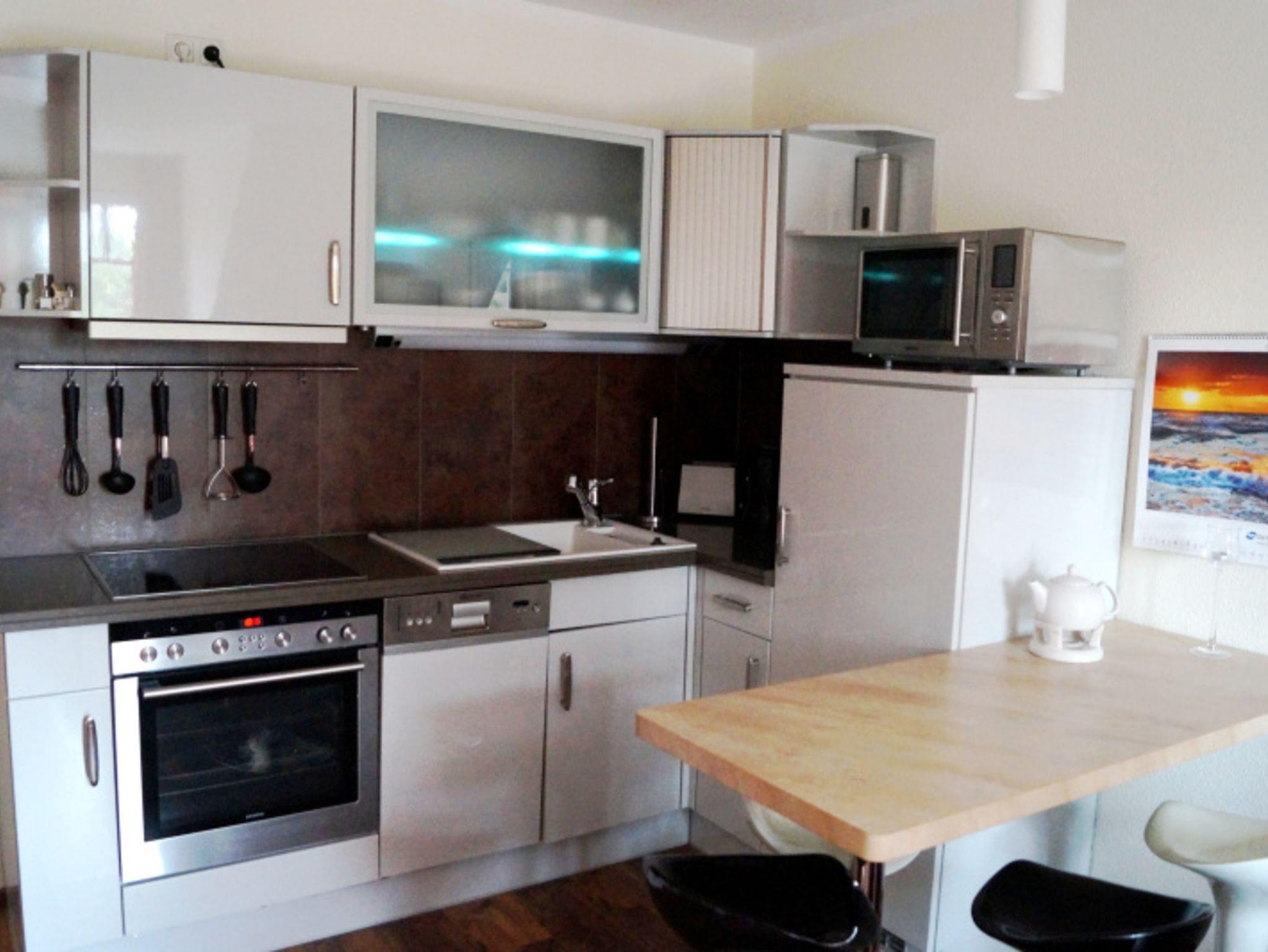 Die offene Küche mit Esstisch und 4 Barhockern ist in das Wohnzimmer integriert und ist unter anderem mit einem Backofen, einem Kühlschrank, einer Geschirrspülmaschine und einer Mikrowelle ausgestattet.