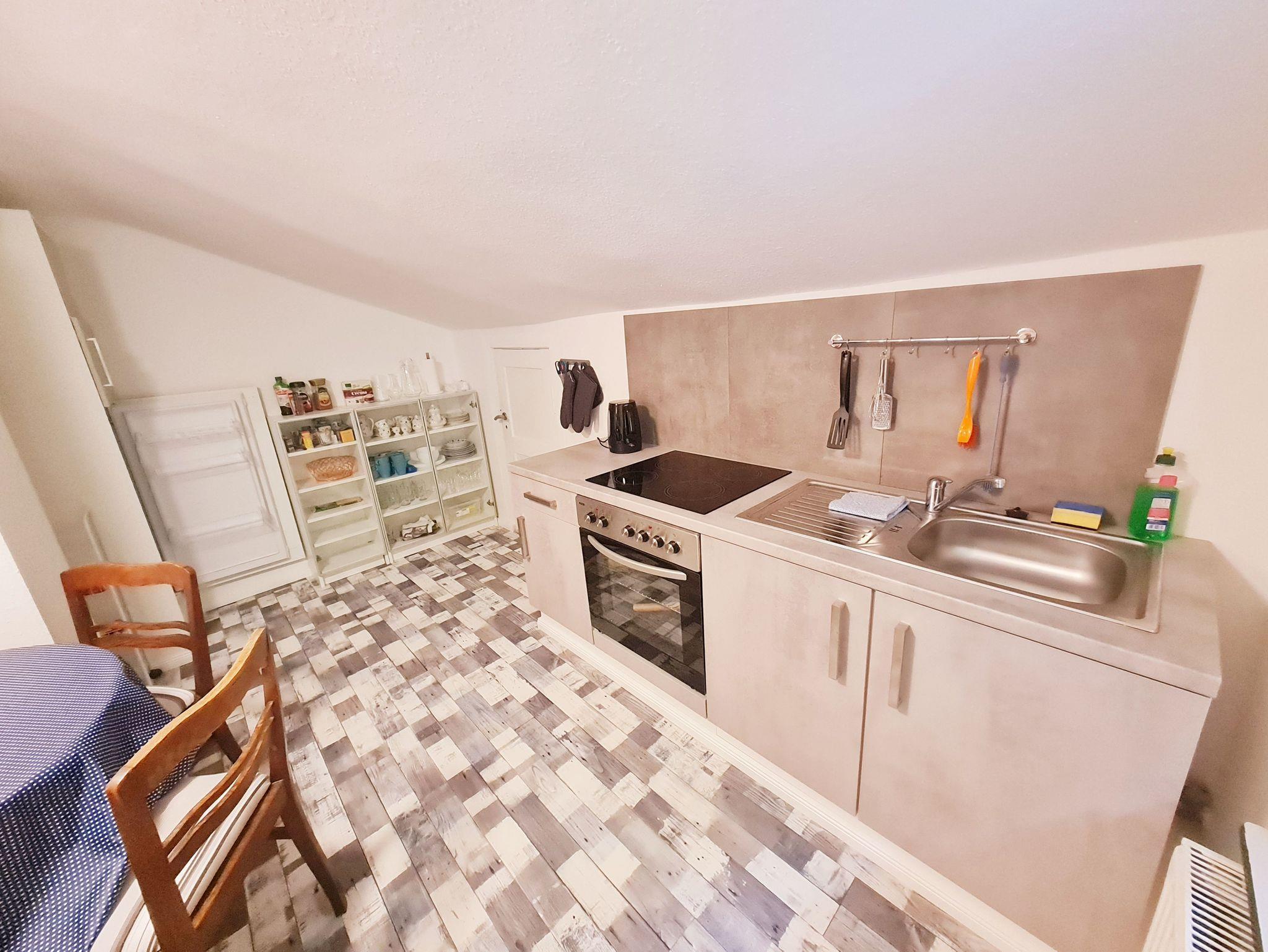 • offene Küche: Küchenzeile mit Herd, Backofen, Kaffeemaschine, Toaster, Wasserkocher, Kühlschrank mit Gefrierfach, Essbereich für 6 Personen mit ausziehbaren Tisch
