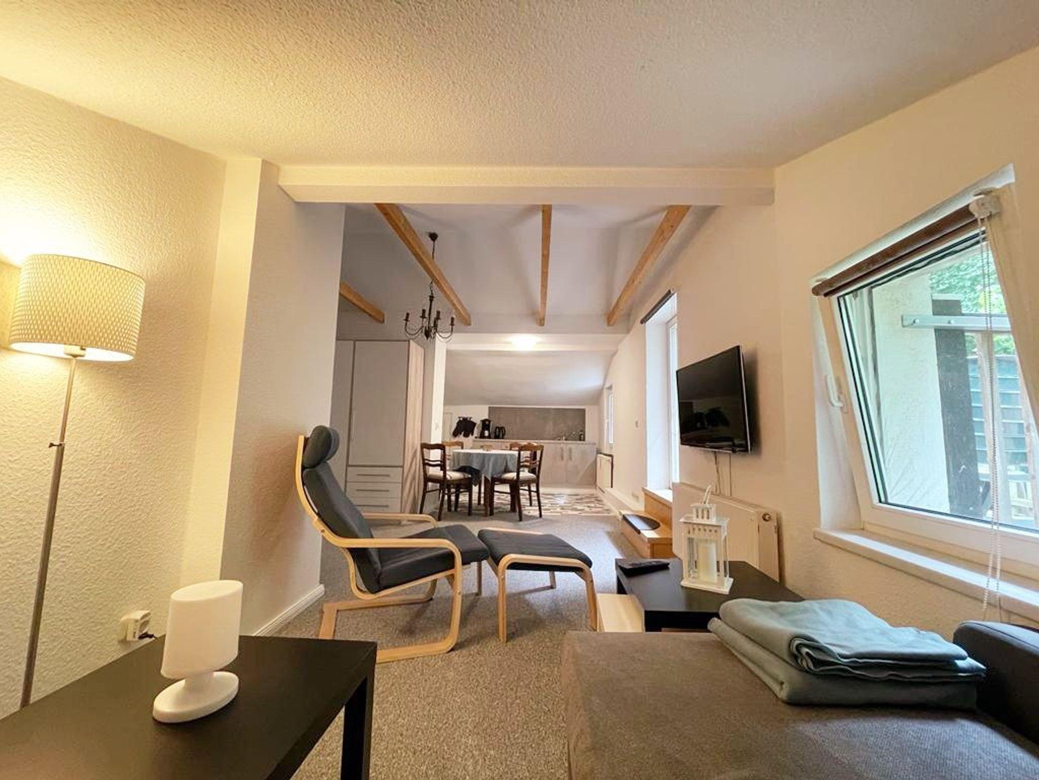 • Wohnzimmer: gemütliche Eckcouch mit Schlaffunktion 130x220cm, Relaxsessel, kleiner Tisch, Flachbild-TV, Leselampe, Radio Kleiderschrank