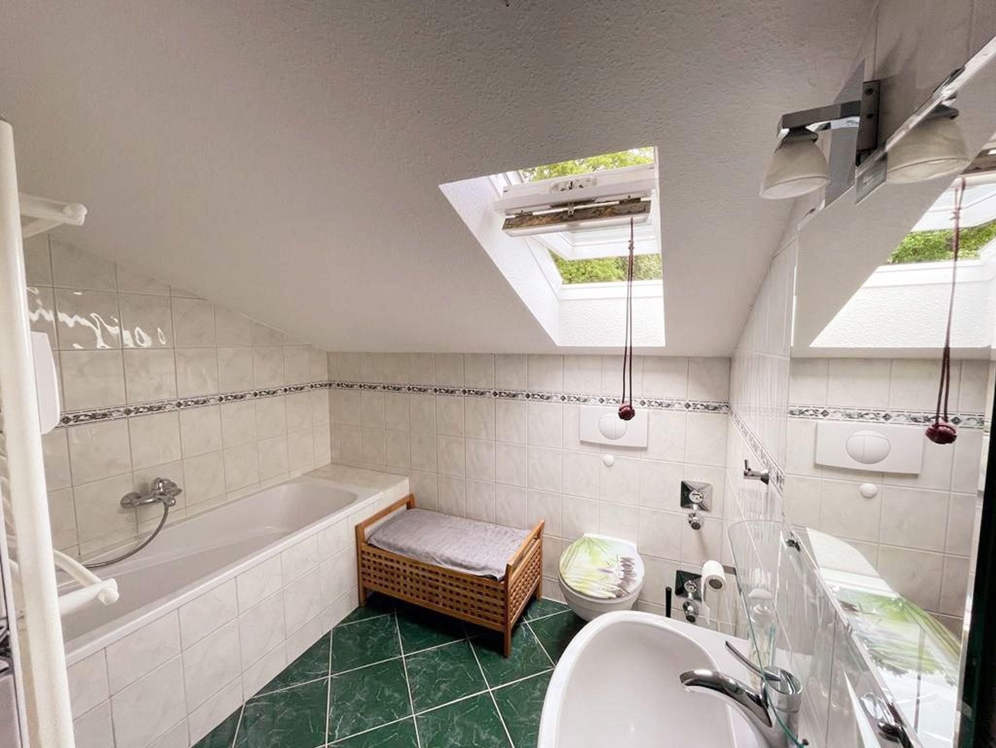 • großes Badezimmer: mit Wanne, WC und Waschbecken, Fön, Spiegel, Sitzbank, Regal, Handtuchheizkörper