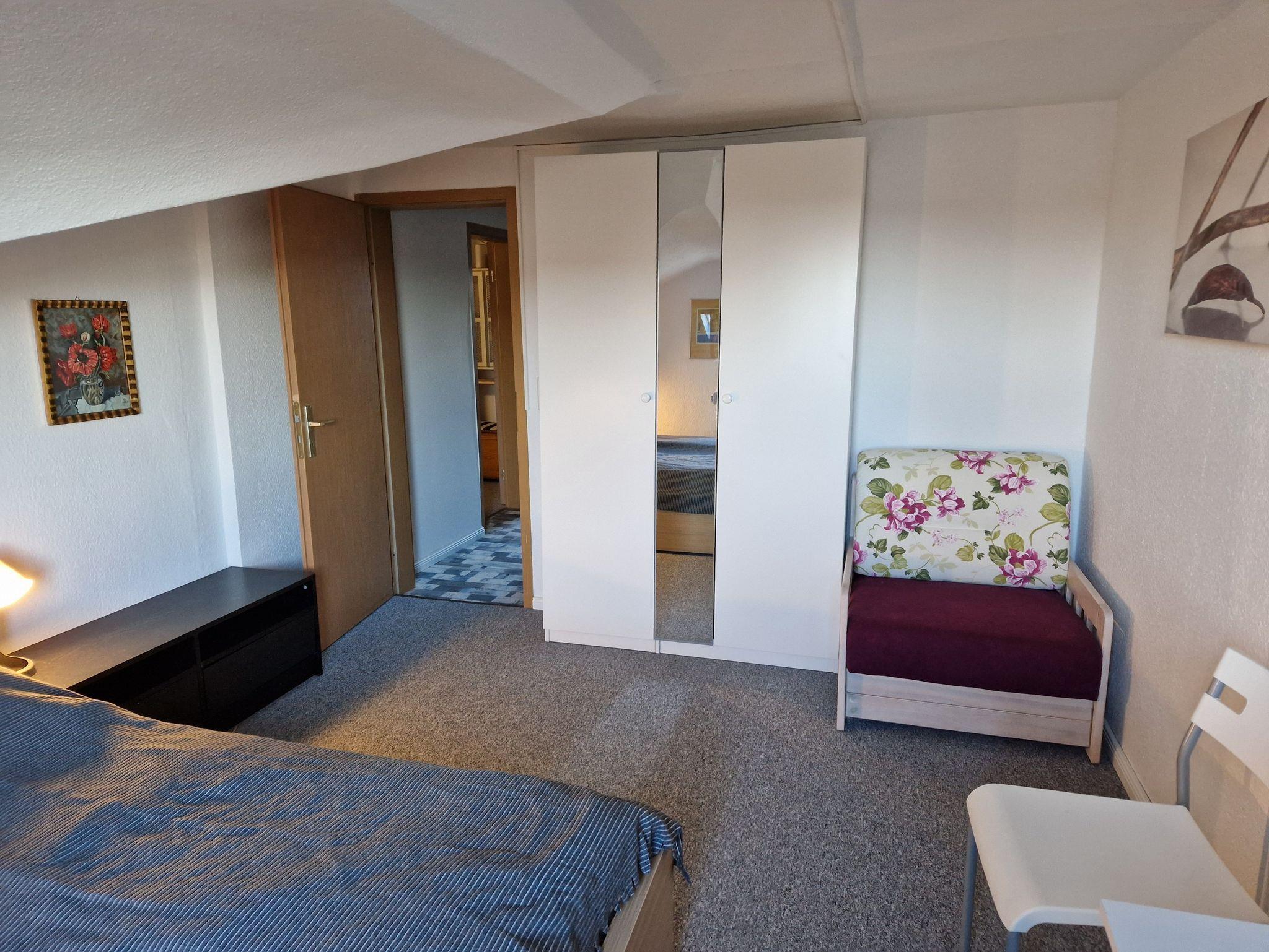 • I Schlafzimmer: Doppelbett mit zwei 80x200 cm Matratze, Kleiderschrank, Nachttische mit Lampe, Schlafsessel mit 80x200 cm, Schreibtsich mit Stuhl, Flachbild-TV