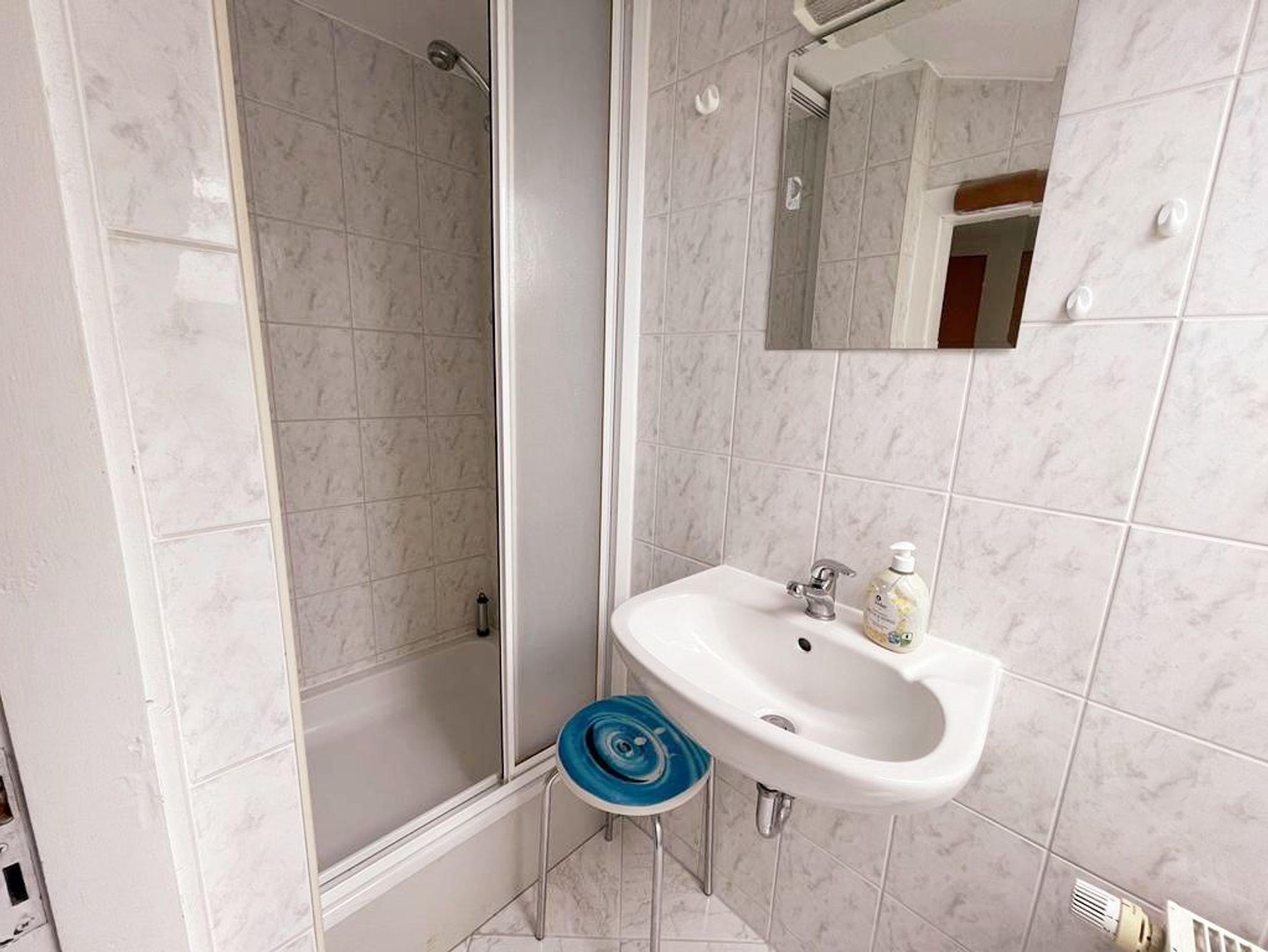 • kleines Badezimmer: mit Dusche, WC und Waschbecken, Spiegel, Hocker