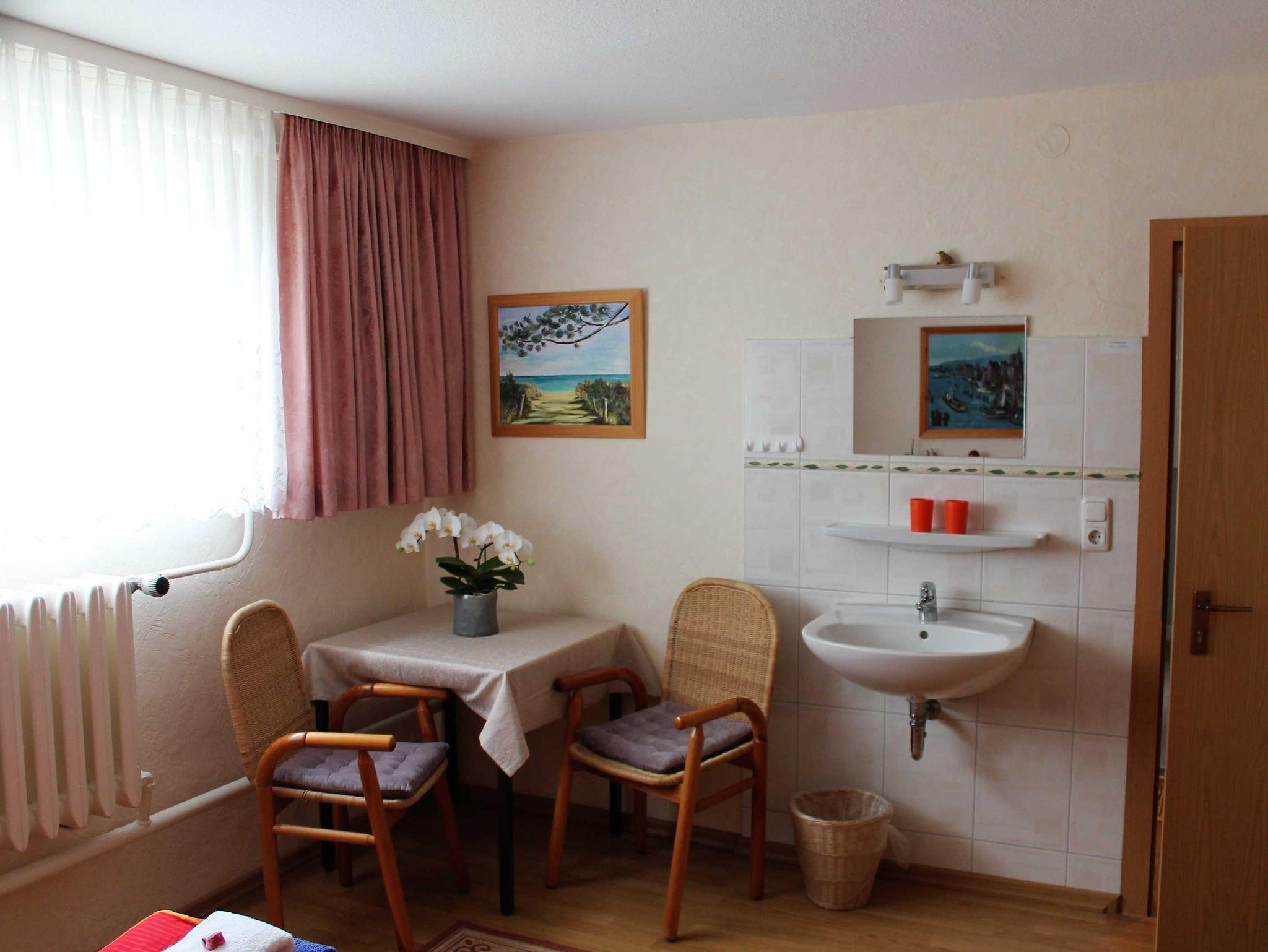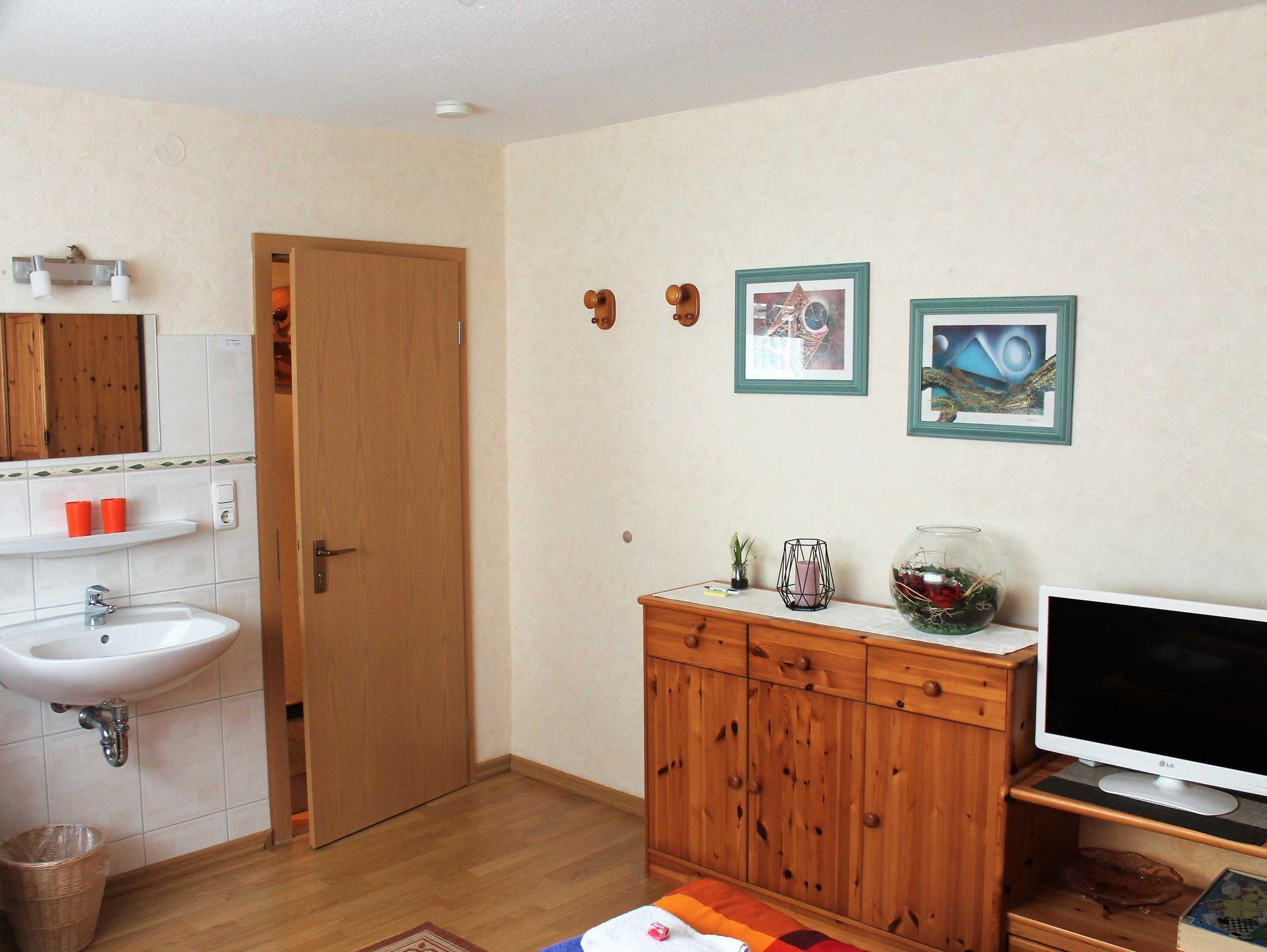 Waschbecken und TV sind in jedem Zimmer vorhanden. Die Dusche und das WC sind getrennt. Eine Sitz- und Grillecke auf dem Grundstück kann jederzeit genutzt werden. Eine Waschmaschinennutzung ist auf Wunsch und nach Absprache möglich.