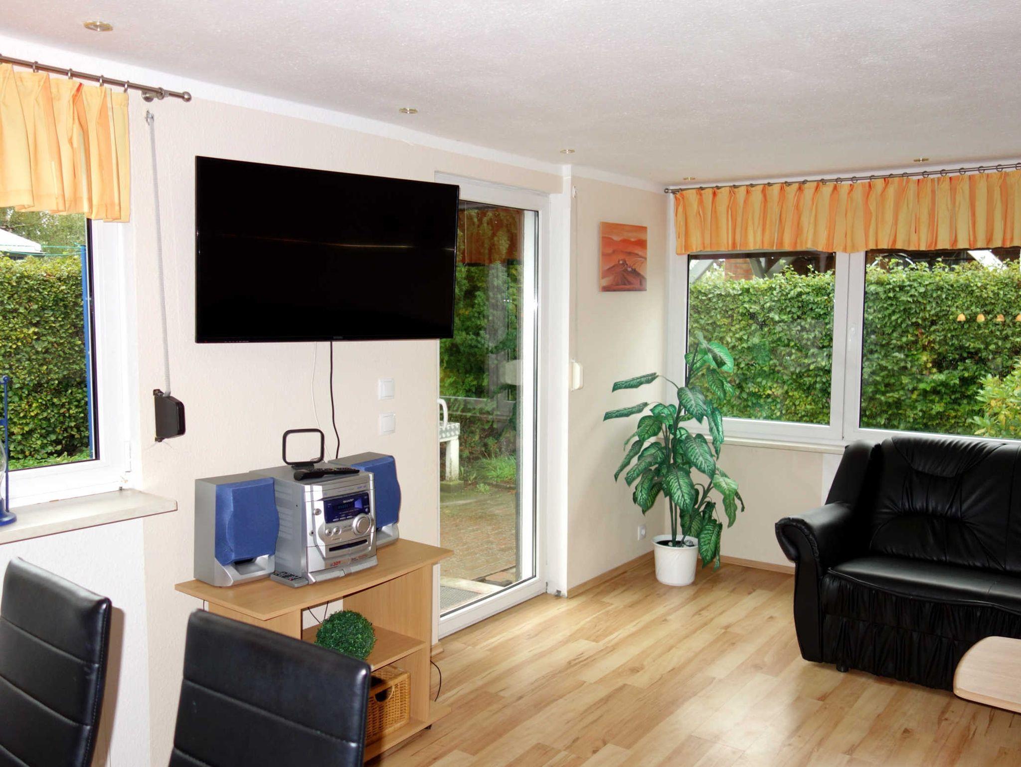 Das große und helle Wohnzimmer verfügt über eine große Couch, einen Sessel, eine kleine Musikanlage, einen Fernseher und einen Kaminofen sowie über eine Essecke mit Esstisch und 6 Essstühlen.