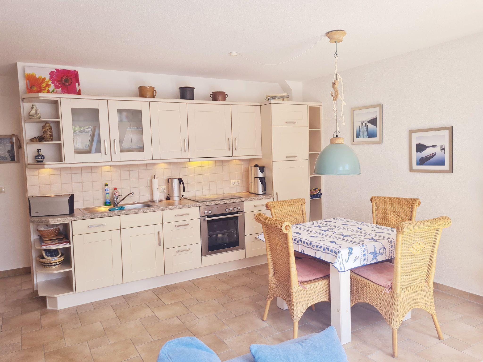• Küche: Küche offen zum Wohnzimmer mit Essbereich für 4 Personen, komplett eingerichtete Einbauküche mit Backofen, Ceranfeld, Geschirrspüler, Toaster, Kaffeemaschine, Wasserkocher, Kühlschrank mit Gefrierfach, Mikrowelle