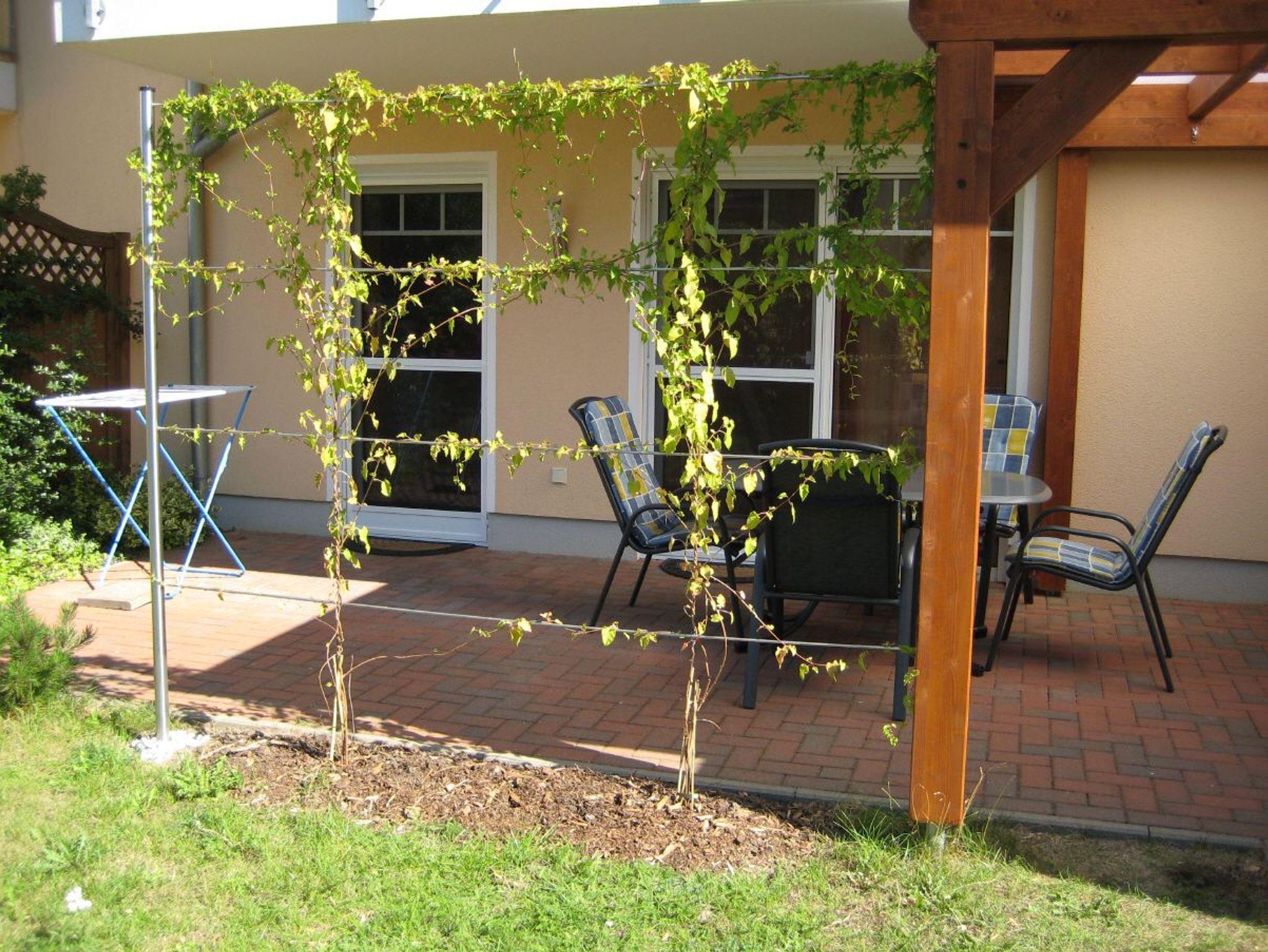 • Terrasse: Südausrichtung mit Gartenstück, großer Tisch, 4 Stühle, Sitzbank und Tisch, für ihren Hund können Sie noch ein Netz zum Nachbarn spannen.