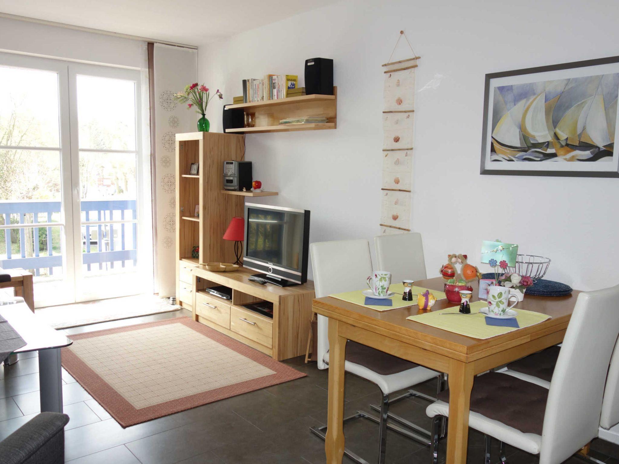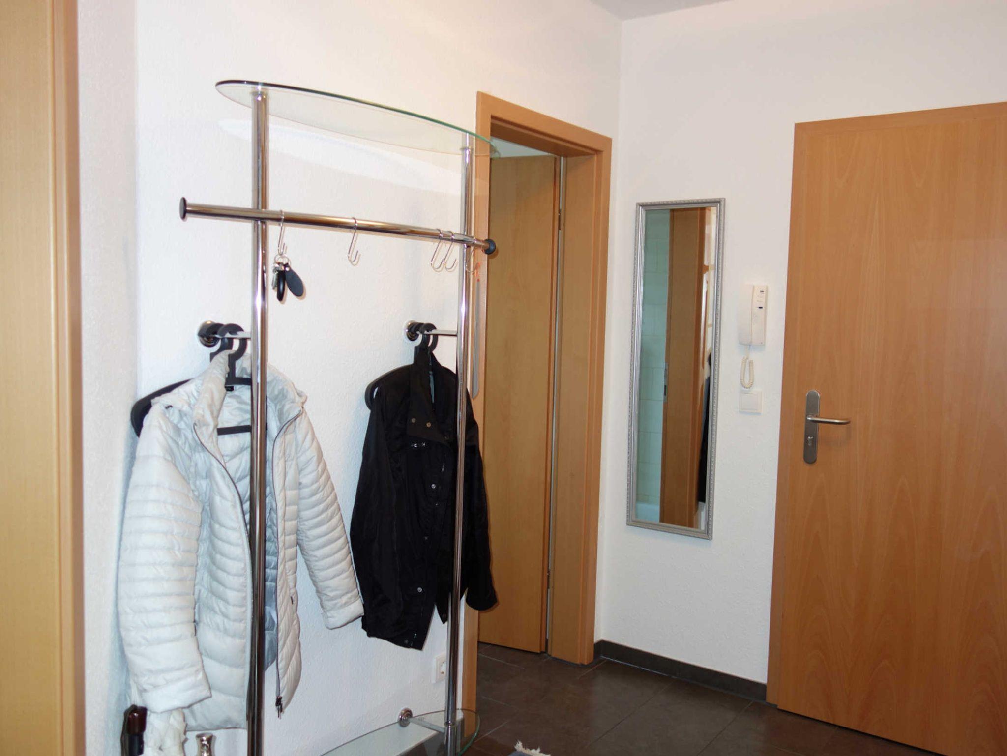 Zu der Ferienwohnung gehören außerdem ein kleiner Flur mit einer Garderobe, ein PKW-Stellpaltz und ein Süd-Balkon mit Balkonmöbeln.