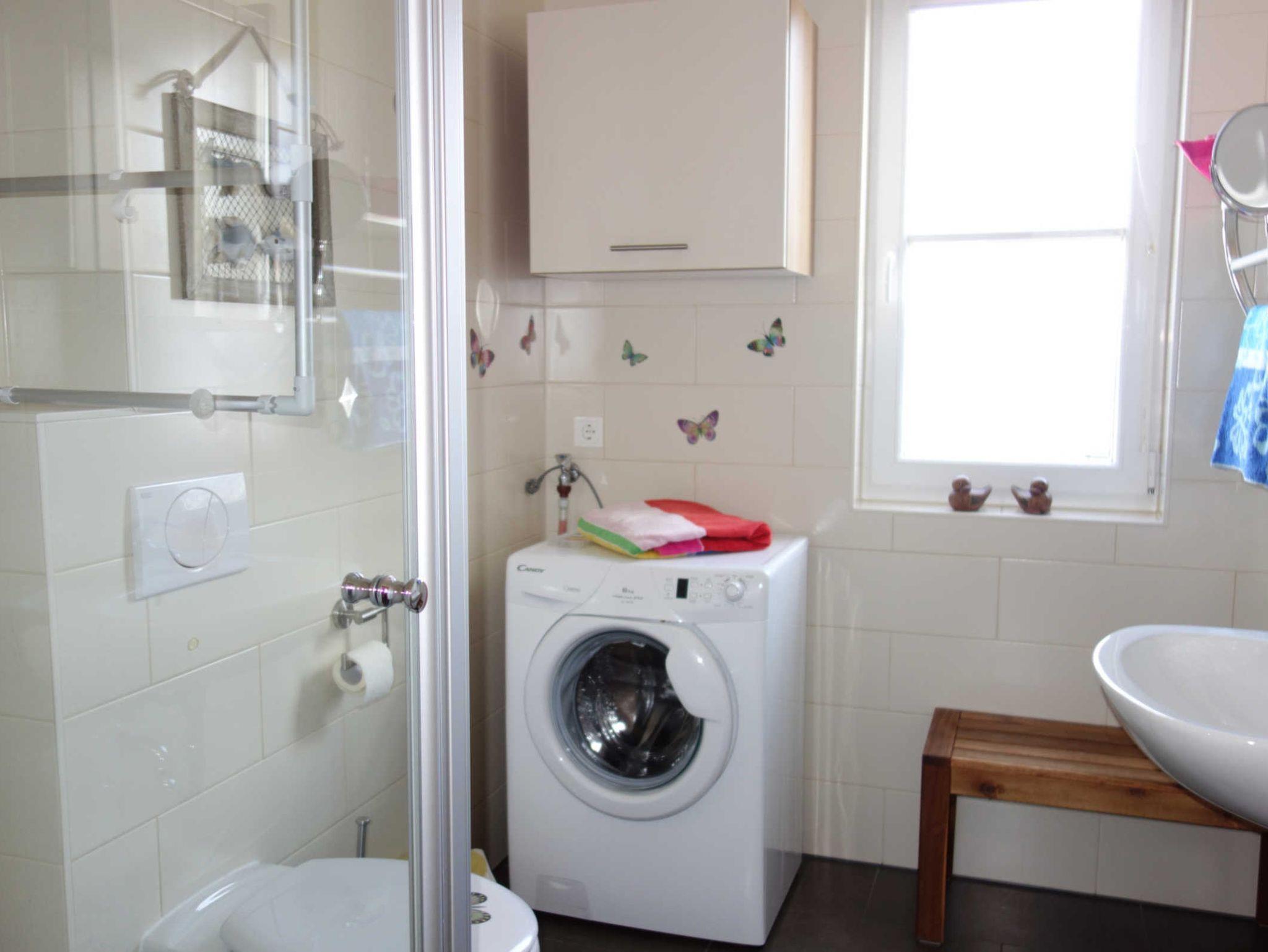 Das Bad mit Fenster verfügt über eine Dusche, eine Waschmaschine und ein WC.