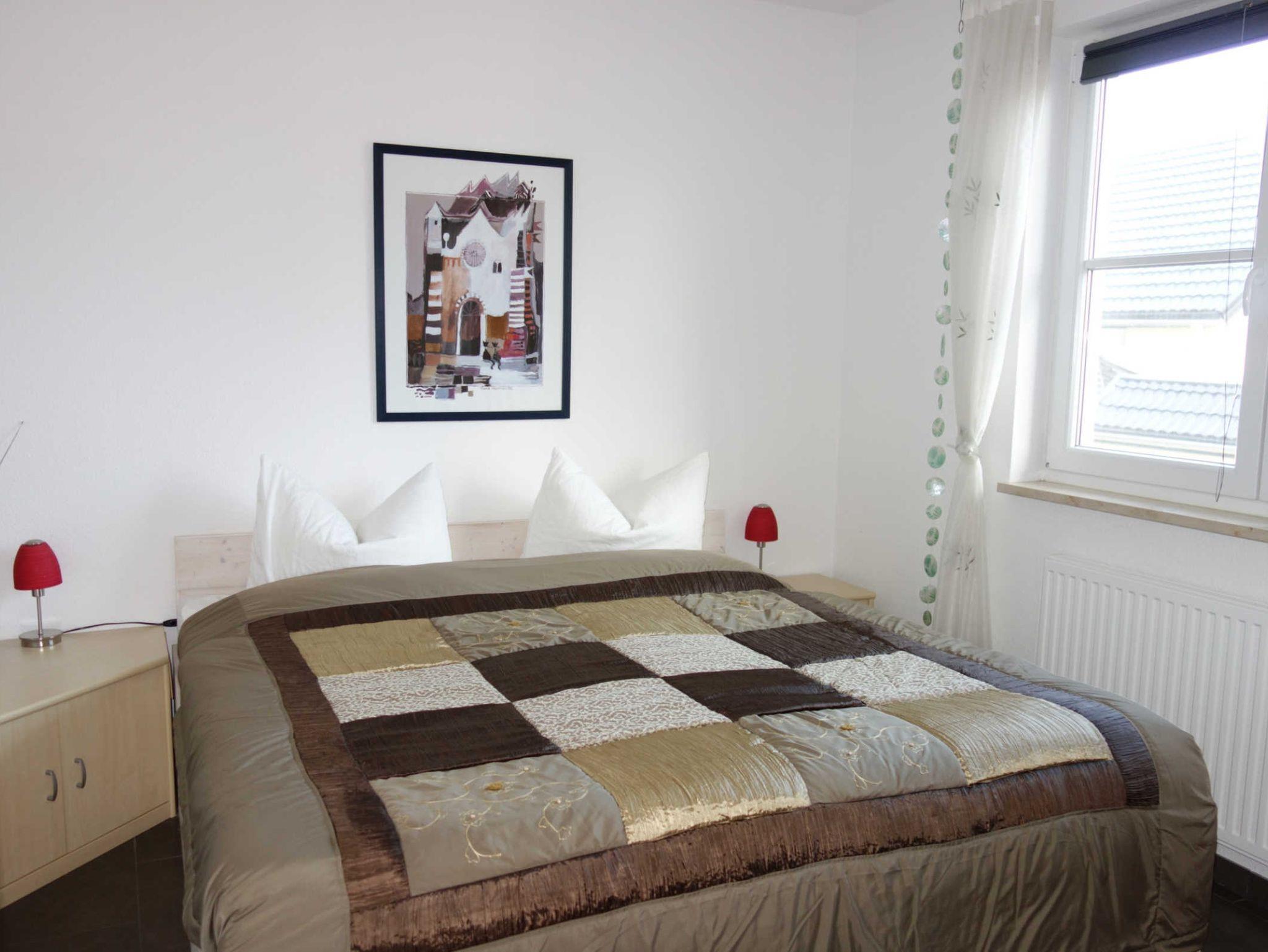 Im Schlafzimmer stehen ein Doppelbett und ein Kleiderschrank.