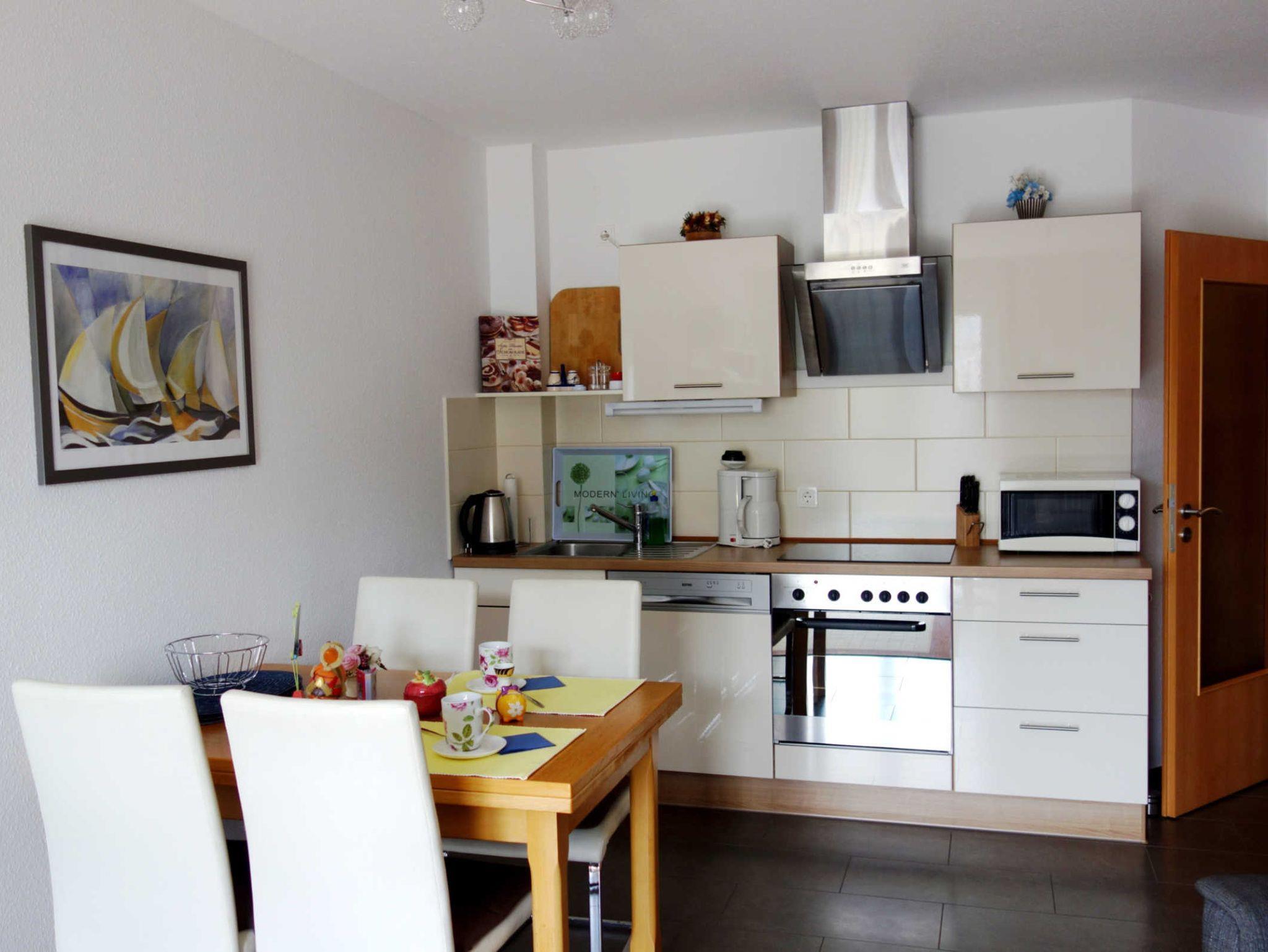 In der zum Wohnzimmer offenen Küche sind u .a. ein Ceranfeld (4 Kochfelder), ein Geschirrspüler, ein Kühlschrank, eine Mikrowelle, eine Kaffeemaschine und ein Wasserkocher zu finden.