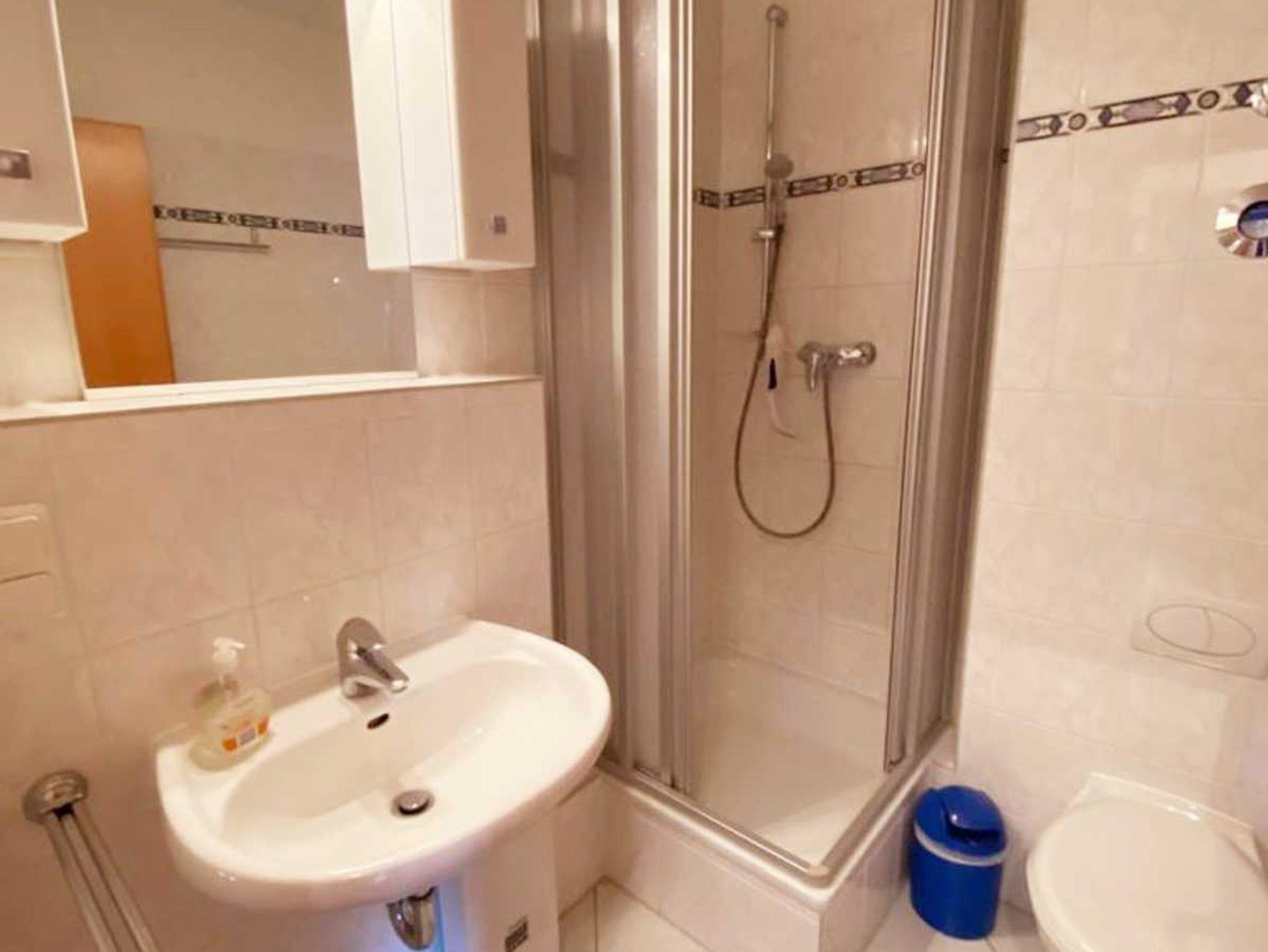 • Bad: ohne Fenster, Dusche, Waschbecken, Toilette, Spiegel, Handtuchhalter