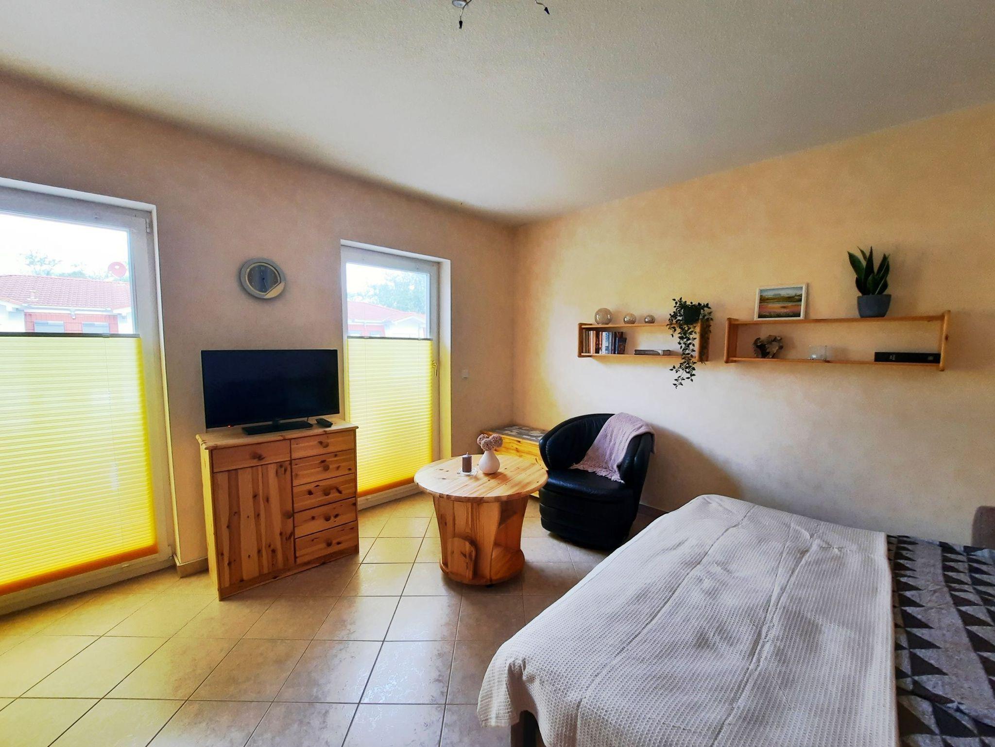 Diese schöne, praktisch eingerichtete Ferienwohnung für 2 Personen ist der ideale Ausgangspunkt für Ihre Urlaubsunternehmungen in und um Graal-Müritz. Der kombinierte Wohn- und Schlafbereich empfängt Sie mit einer Schlafcouch, 2 Sitzmöglichkeiten und einem Fernseher. Von hier aus gelangen Sie zum großen Balkon mit Gartenmöbeln. Die kleine Pantryküche ist mit 2 Kochfeldern, einer Mikrowelle, einer Kaffeemaschine und einem Wasserkocher ausgestattet. Das Bad ist mit einer Dusche und einer Handtuchheizung ausgestattet. Die gesamte Ferienwohnung verfügt über Plissees und elektrischen Rollläden. Zur Wohnung gehört ein PKW-Stellplatz vor dem Haus.