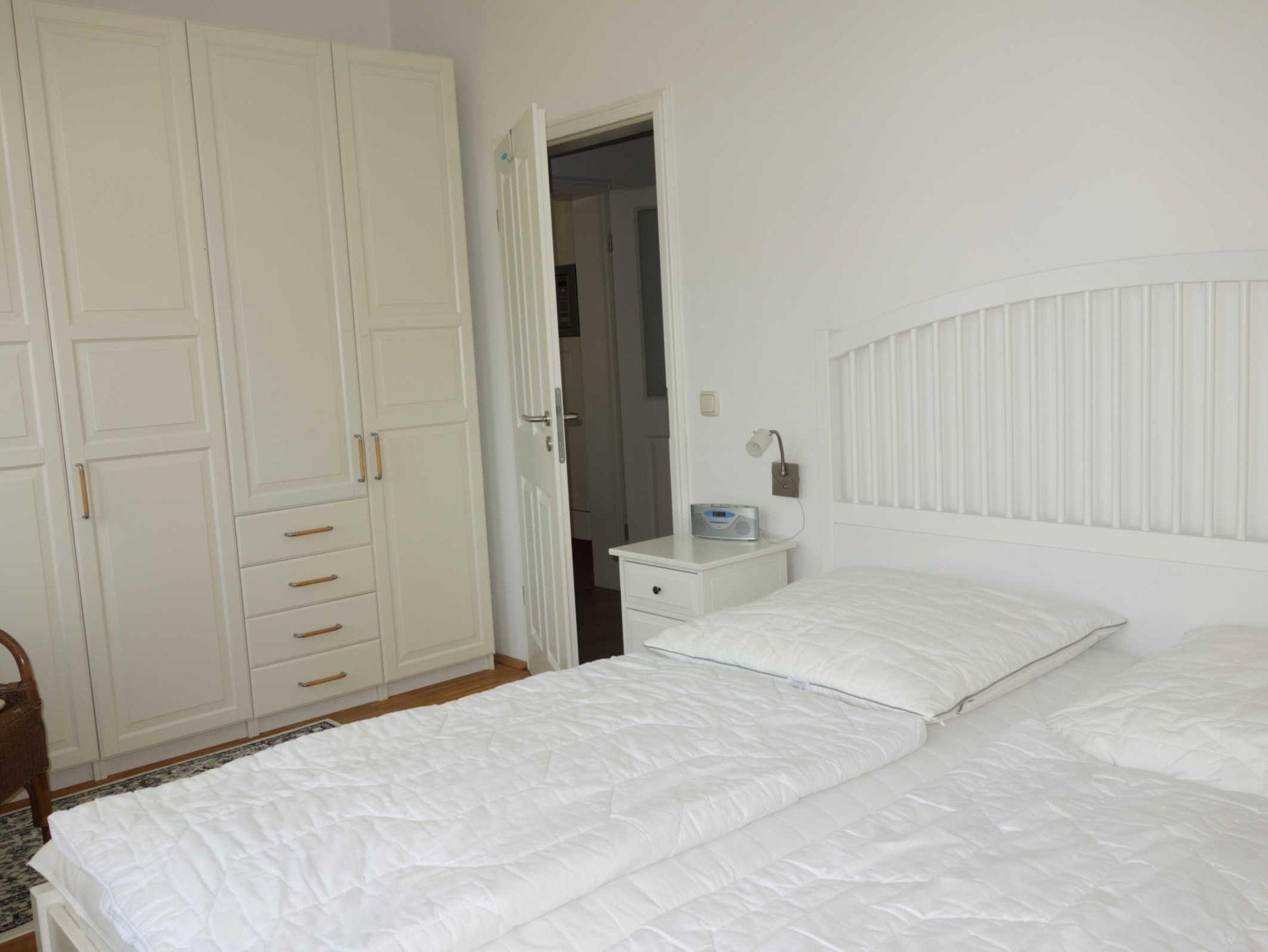 Ein Schlafzimmer verfügt über ein Doppelbett (180x200cm) und einen großen Kleiderschrank. Im zweiten Schlafzimmer befindet sich ein Tandembett (2x80x200cm).