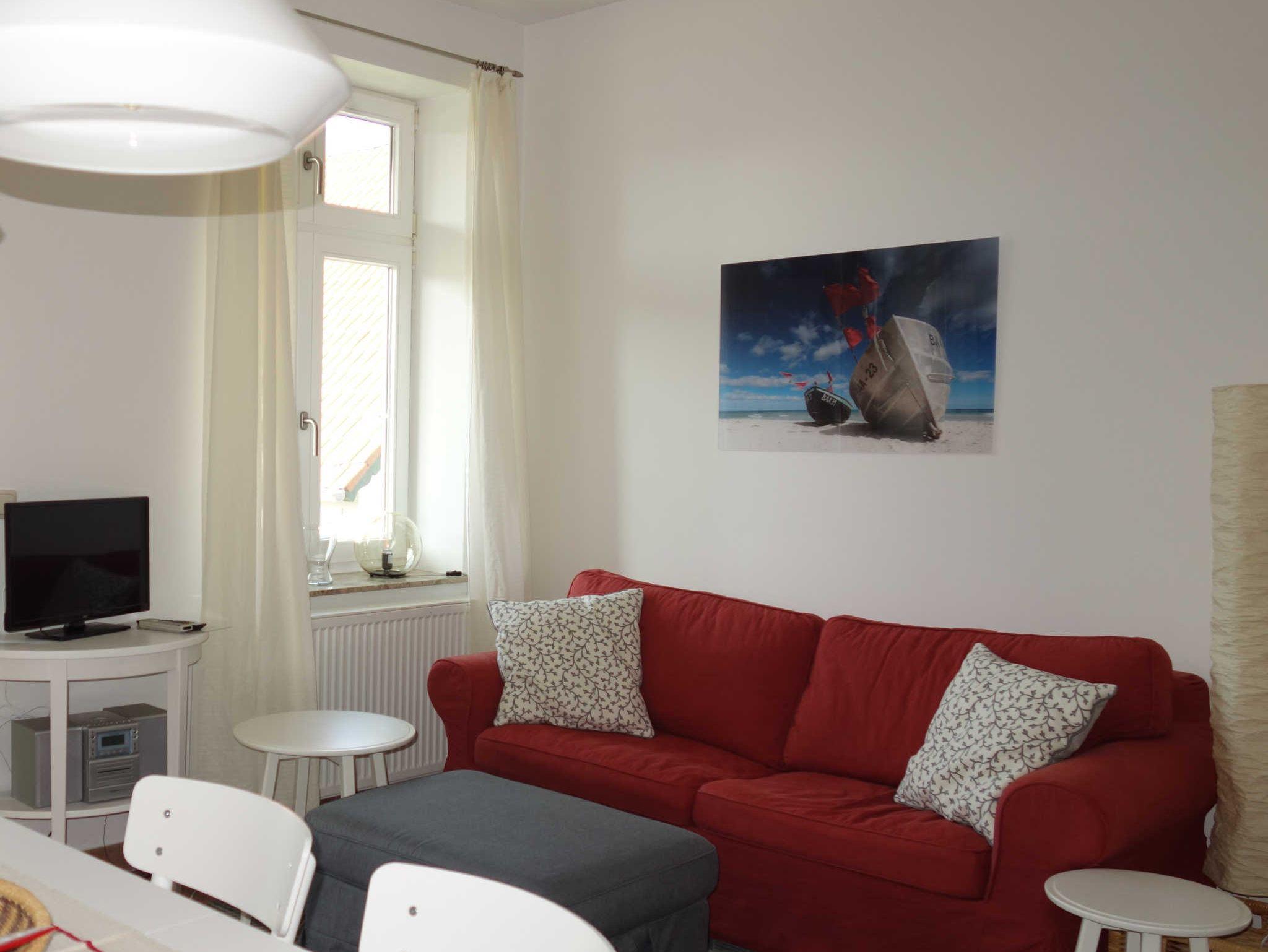 Im schönen Wohnbereich befindet sich eine Couch sowie ein Flachbildfernseher und ein Radio.