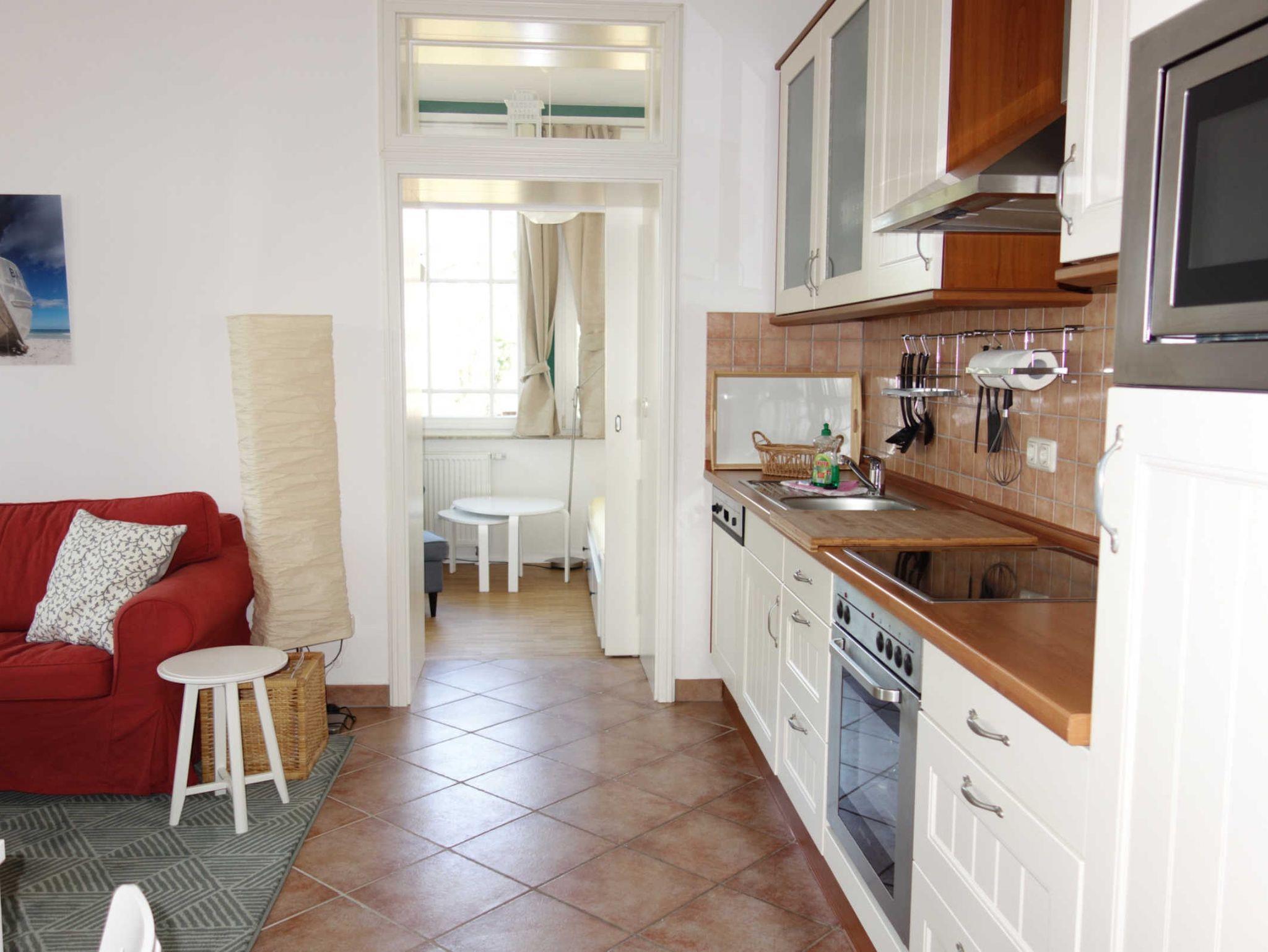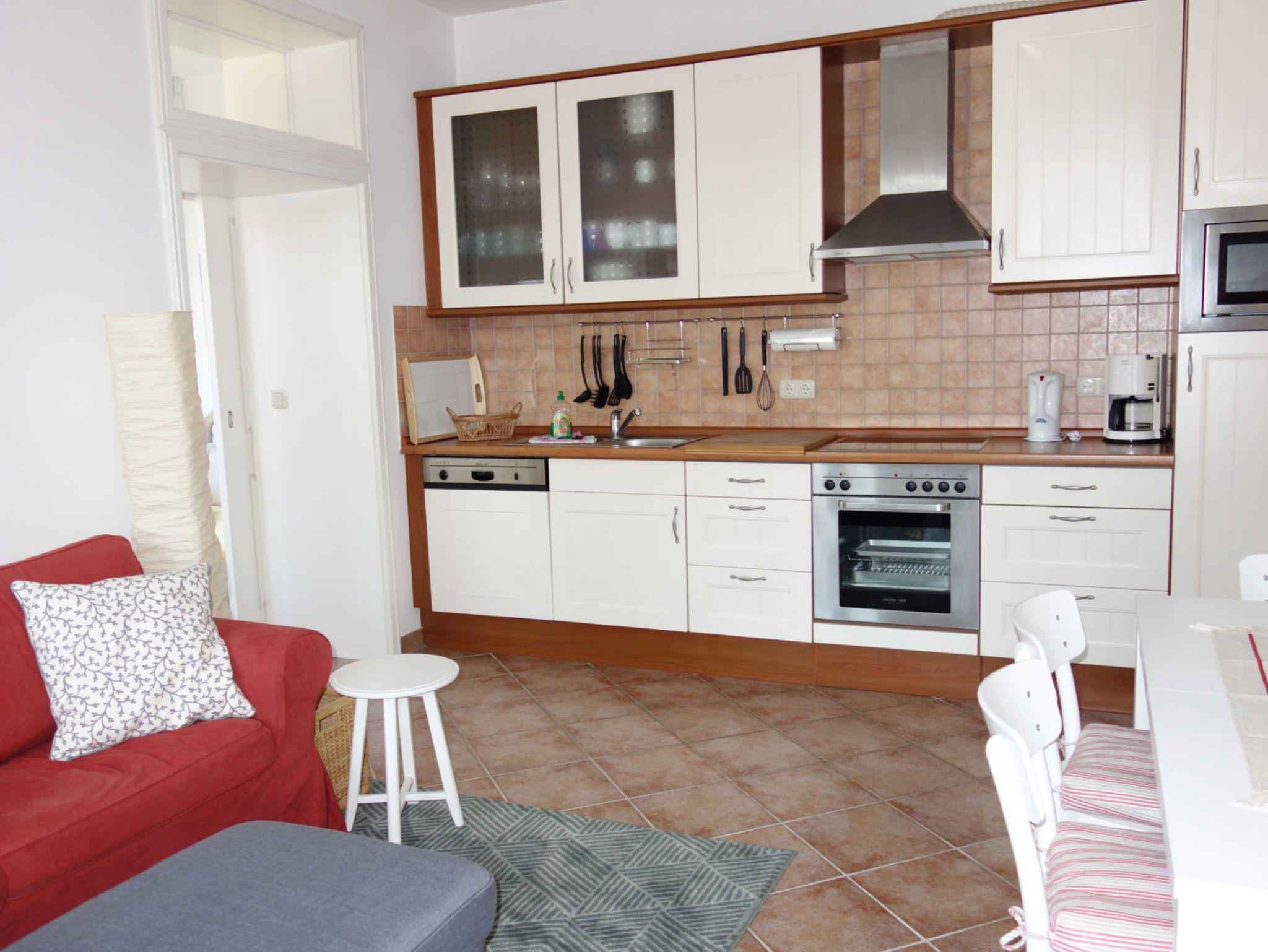 Die in das Wohnzimmer integrierte Küche ist komplett ausgestattet u.a. mit einem Ceranherd mit 4 Kochfeldern, einem Backofen, einem Geschirrspüler, einem Kühlschrank mit einem Gefrierfach, einer Mikrowelle, einer Kaffeemaschine und einem Wasserkocher.