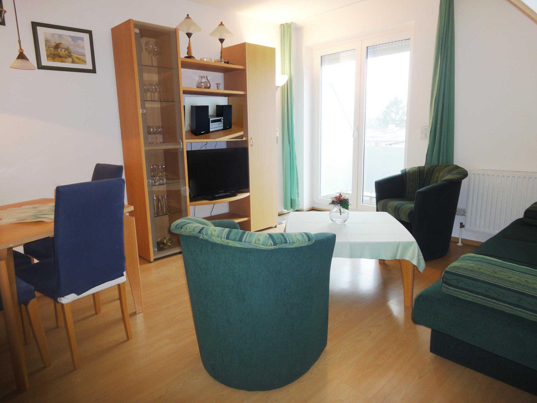Der Wohn- und Schlafbereich ist mit einer Schlafcouch für 2 Personen ausgestattet und verfügt über eine kleine Stereo Anlage mit CD-Player sowie einen Flachbildfernseher. Zu dem Appartement gehört ein Balkon mit Richtung gen Süden.