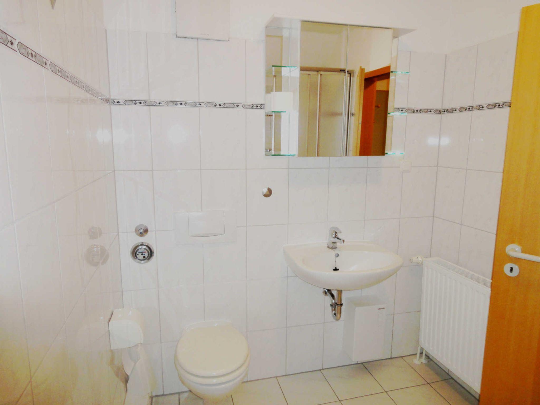 Das geflieste Bad ist mit einer Dusche, einem Waschtisch und einem WC ausgestattet.