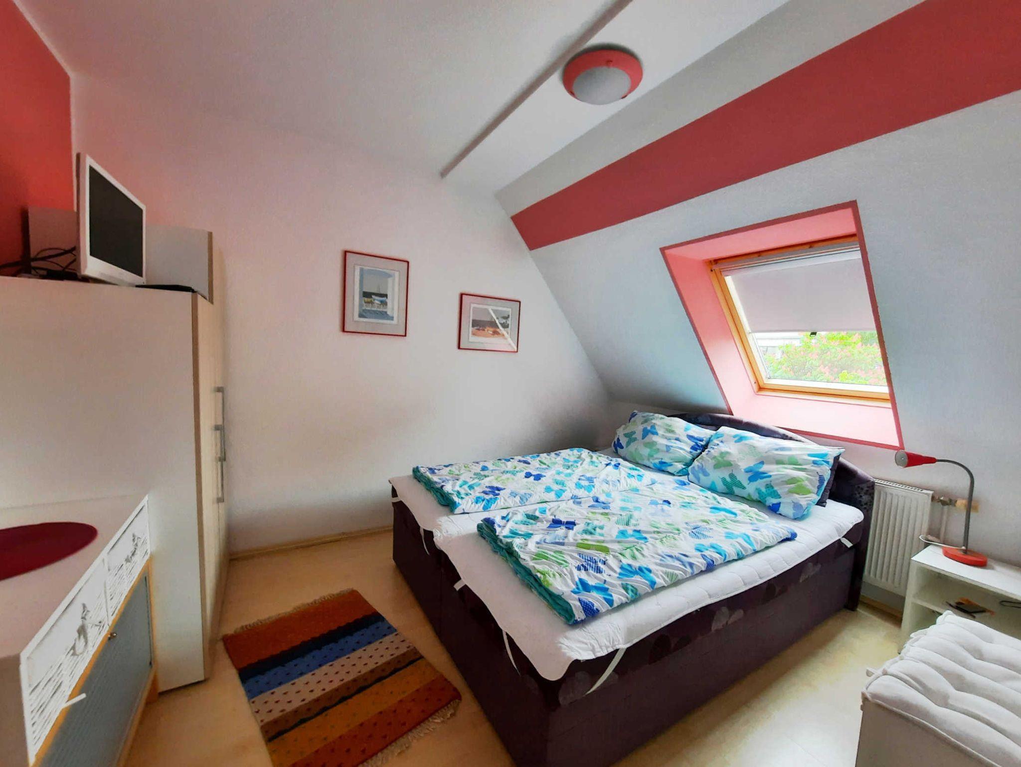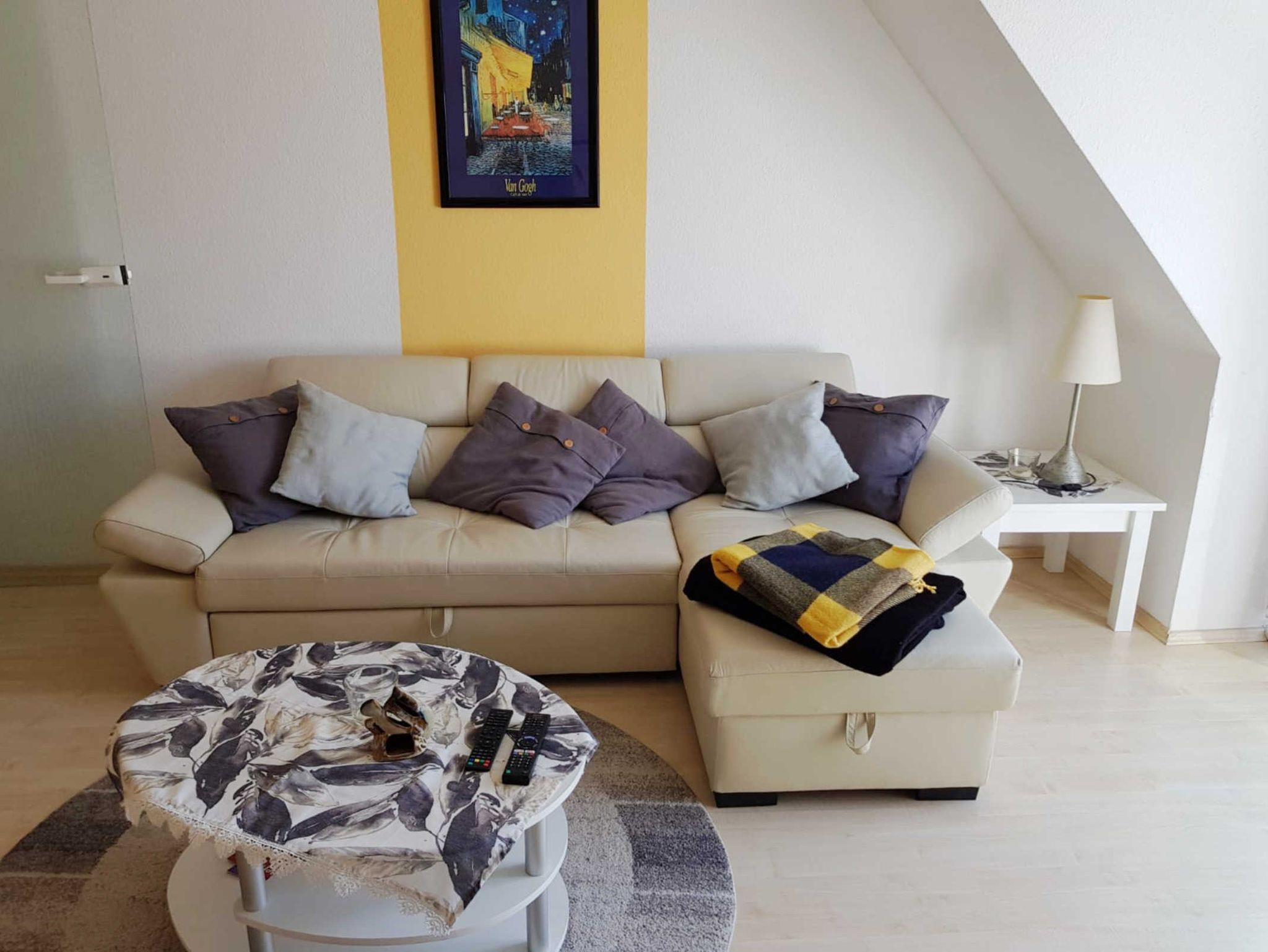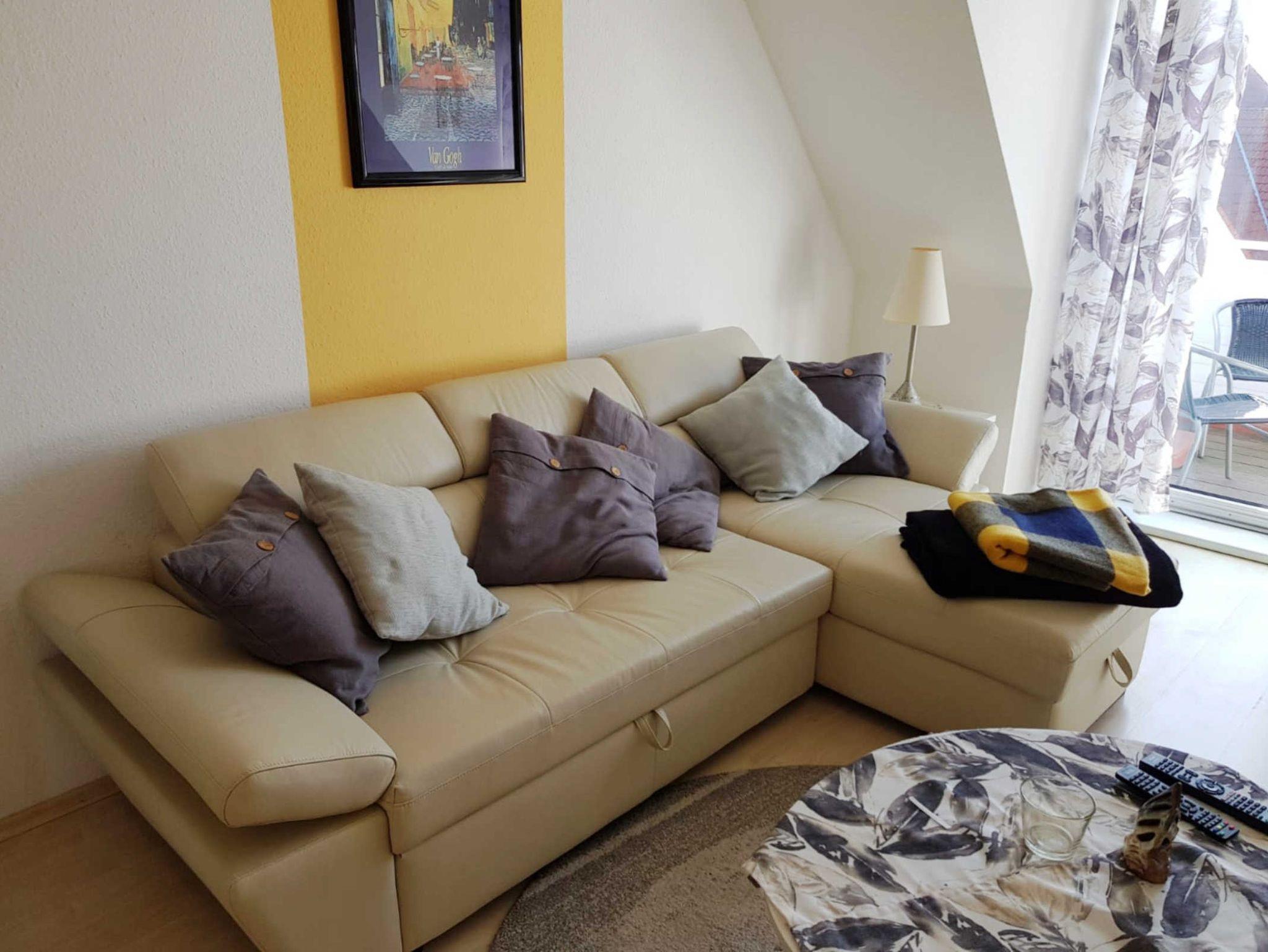 2 Zimmer Ferienwohnung in der Kastanienallee mit einem Wohnzimmer mit Couch und Fernseher, ein Bad mit einer Dusche und einem WC, eine Küche mit einem Backofen und einem Kühlschrank, ein Schlafzimmer mit einem Doppelbett. Zu der Ferienwohnung gehören ein Balkon und ein PKW-Stellplatz.